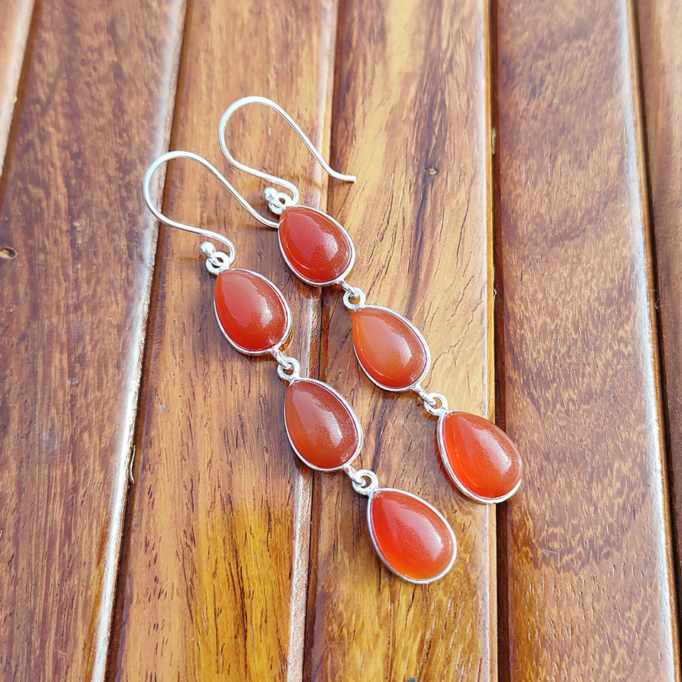 Boucles d'oreilles pendantes longues en laiton plaqué argent avec pierres précieuses naturelles en cornaline, serties en clos, style bohème chic, cadeau pour femme