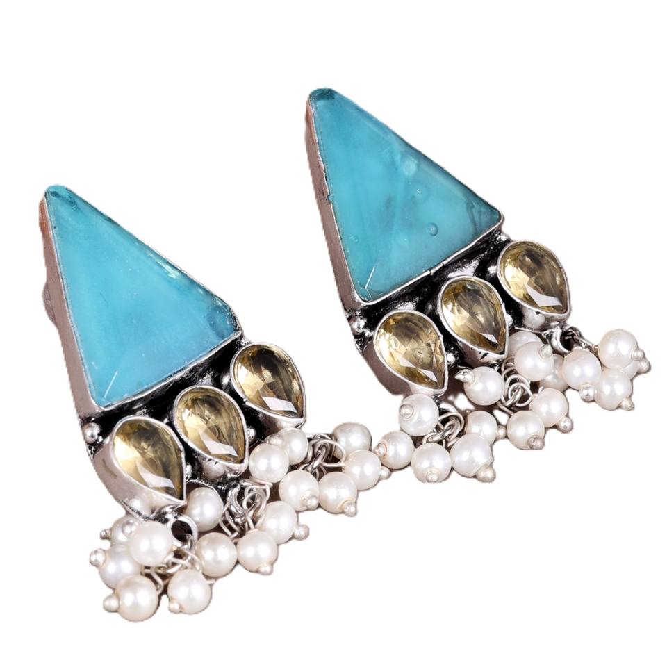 Boucles d'oreilles pendantes ethniques bohèmes en turquoise avec pierres dorées en forme de goutte et perles