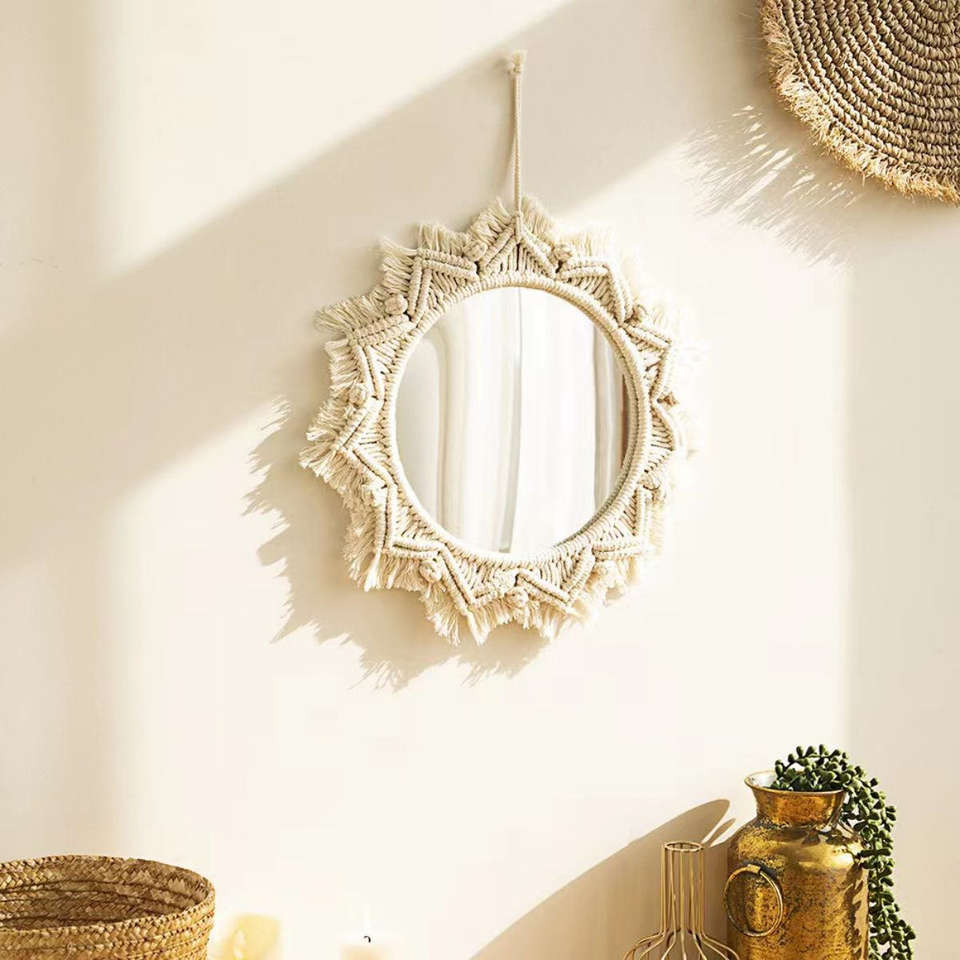 Miroir mural rond en macramé Boho Tapisserie en corde de coton Miroir suspendu pour chambre à coucher et décoration intérieure