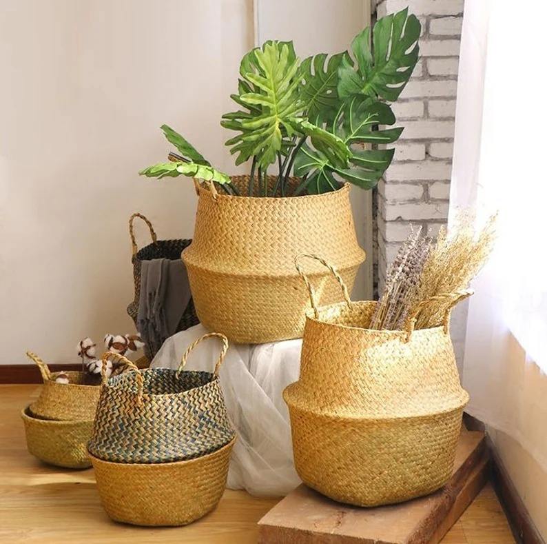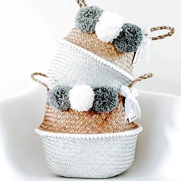 Boho Seagrass Belly Basket with Poms Grey Pom Pom Planter Basket Large Wicker Water Hyacinth Storage Basket Home Decoration Gift