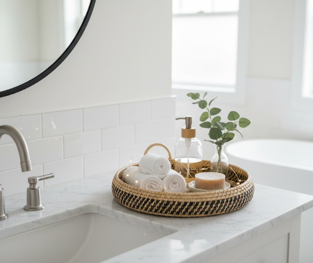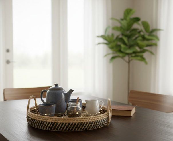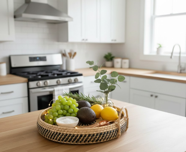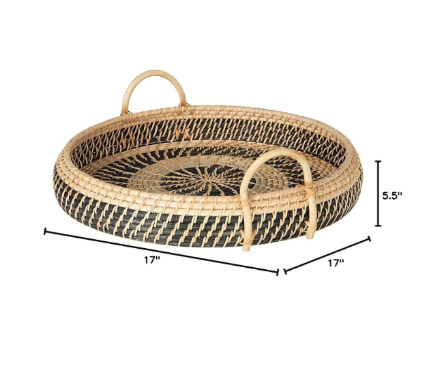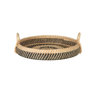 Plateau rond en jonc de mer tressé à la main style bohème avec poignées, plateau décoratif en osier noir naturel pour table, décoration intérieure du Vietnam