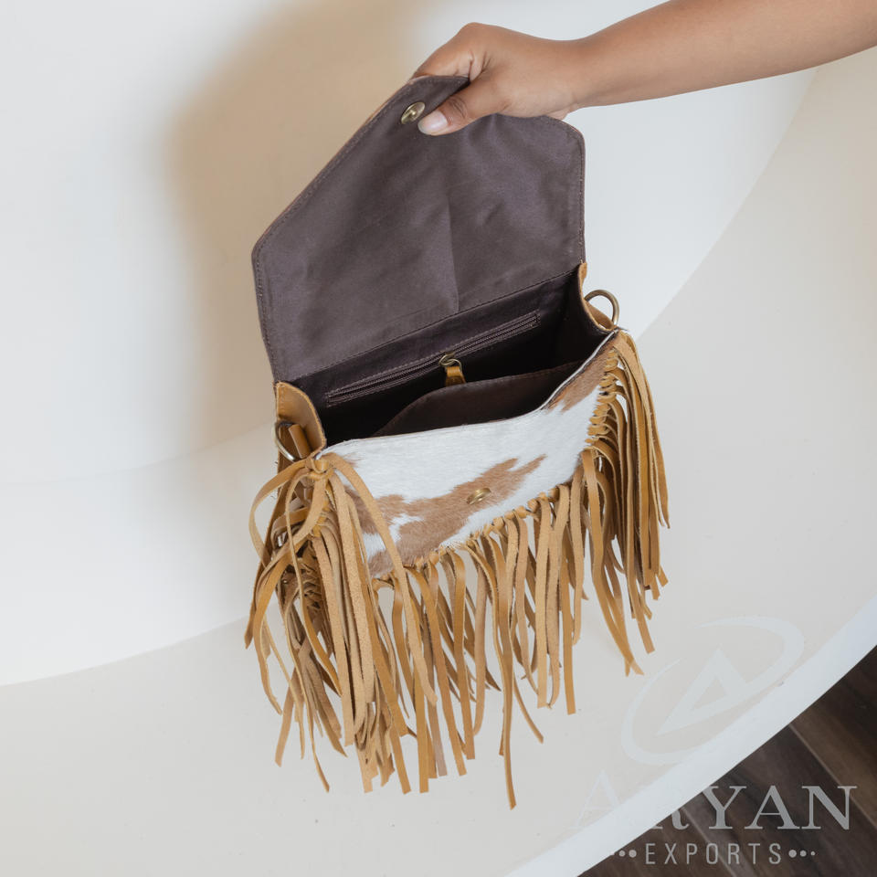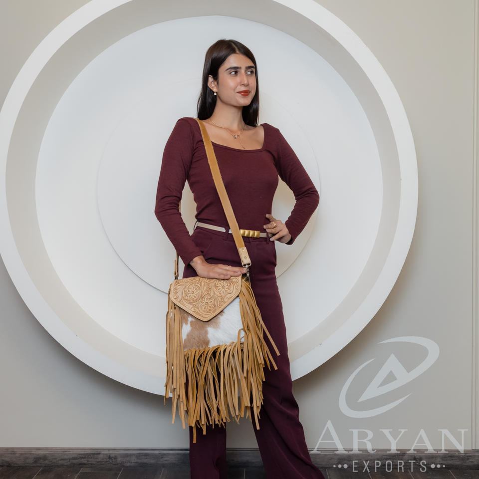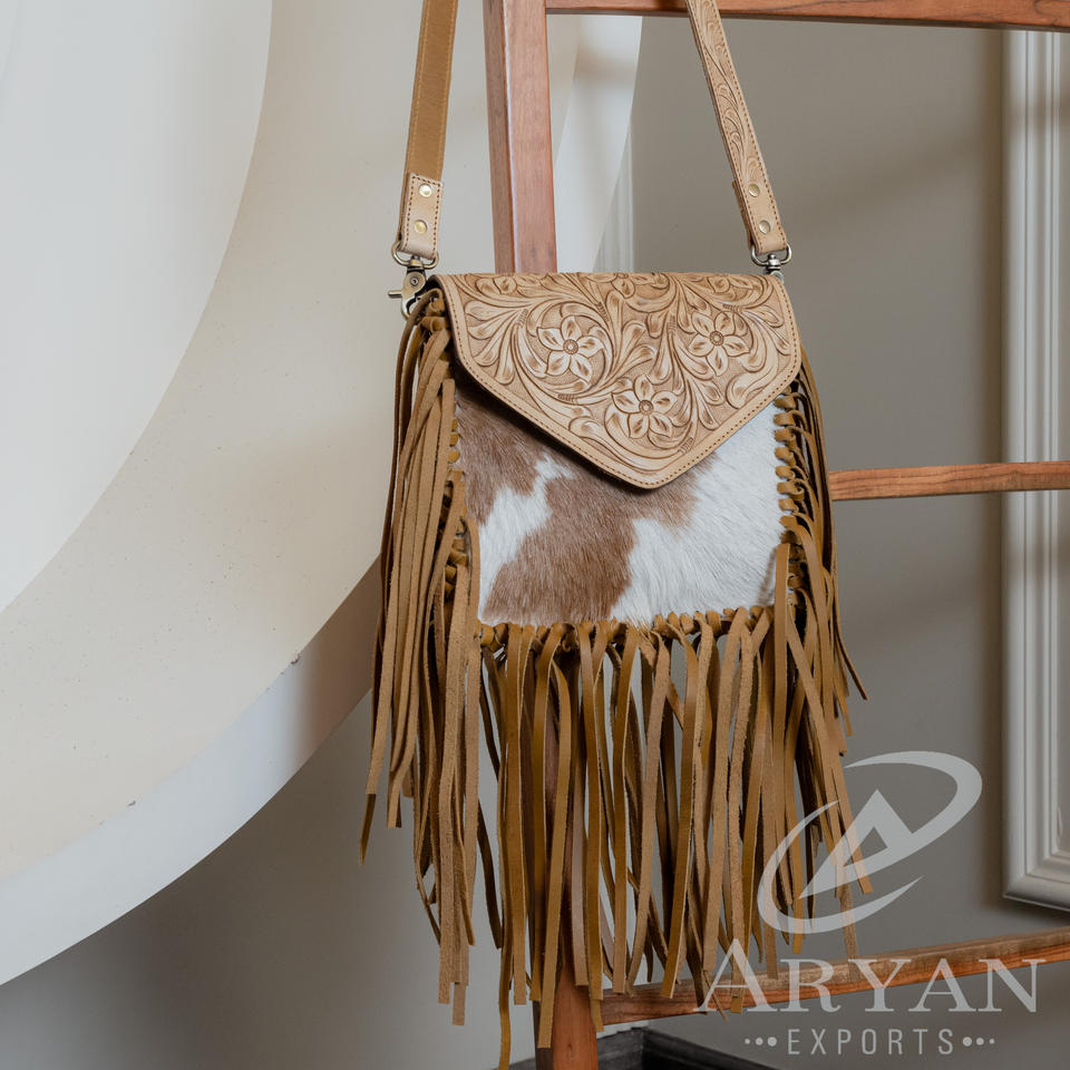 Handcrafted Tooled Cowhide Leather Fringe Shoulder Bag