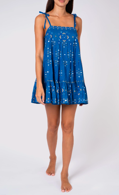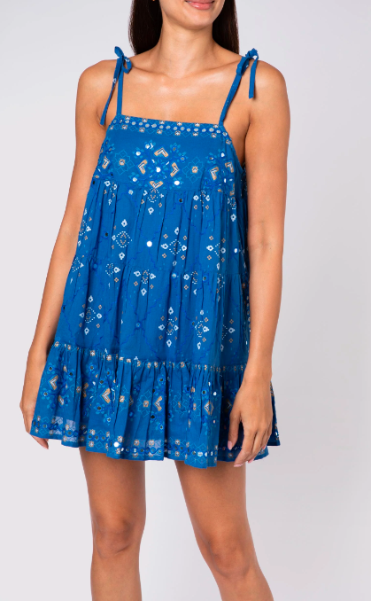 Bold Blue Turn Head Mosaic Print Femmes Fun Mini Robe Réglable Cravate Épaule Sexy Fille Bretelles Spaghetti Beach & Bar Robe Courte