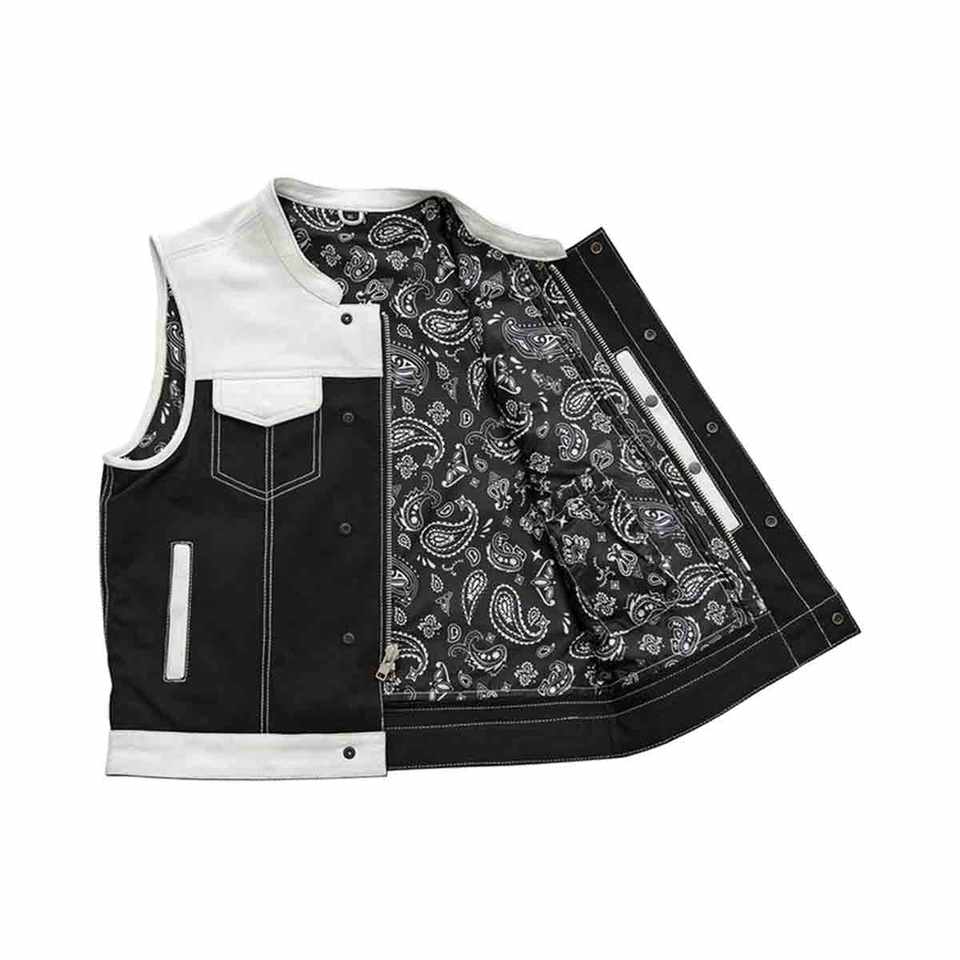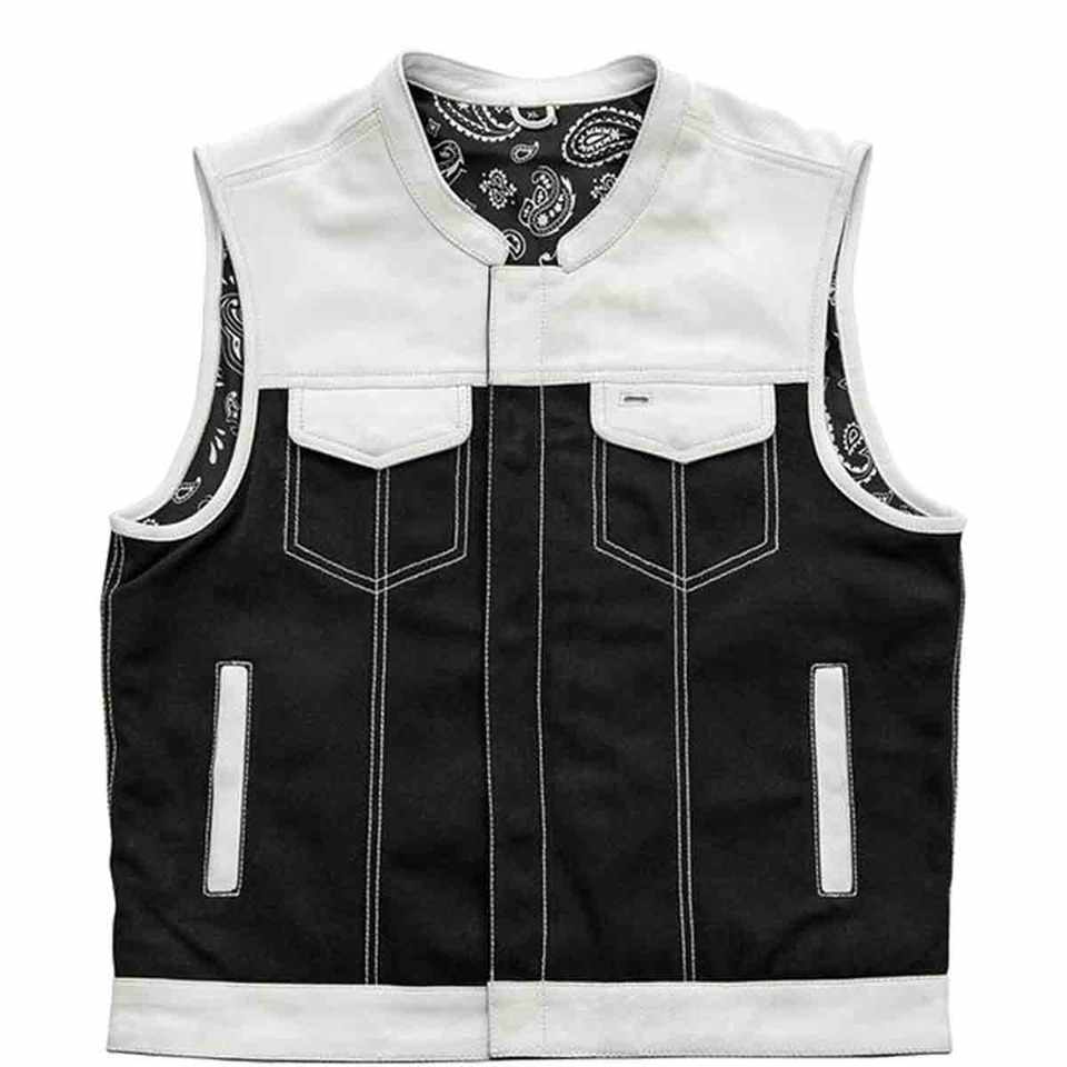Gilet respirant en cuir et toile avec empiècements contrastés, fermeture boutonnée intégrale, couleur noire audacieuse.