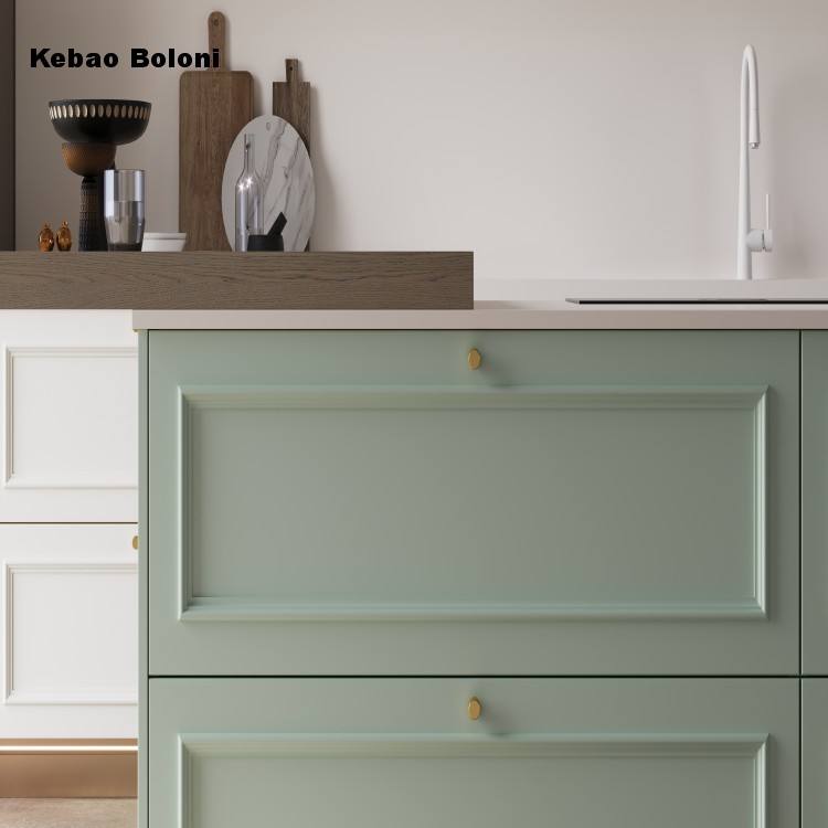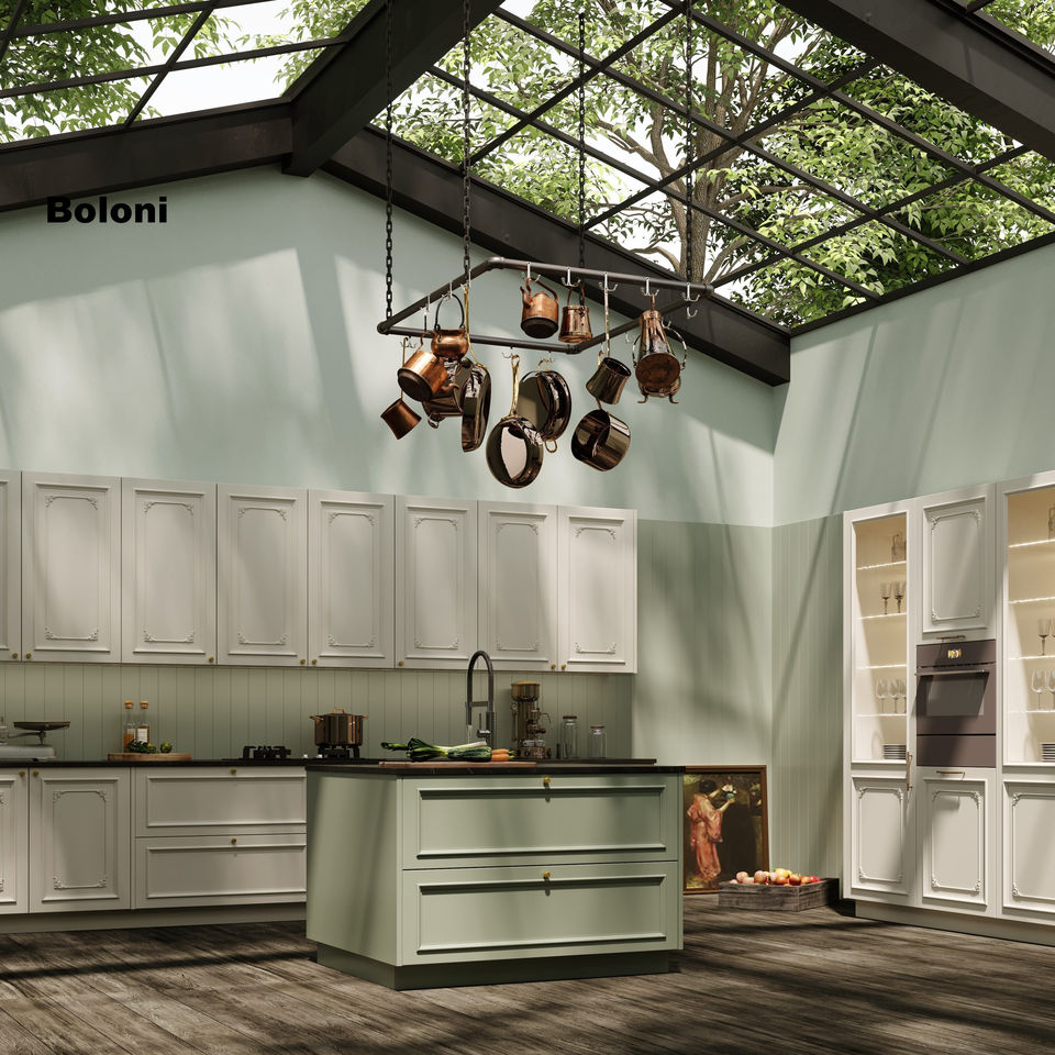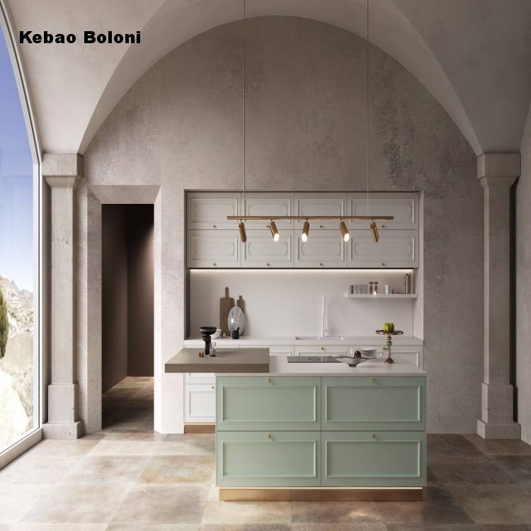 Boloni, îlot de cuisine en bois de style campagnard français moderne, design personnalisé, armoires de cuisine hautes, meubles de cuisine