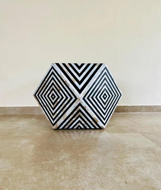 Table d'appoint de lit en incrustation d'os Tabouret design rayé en forme de diamant en incrustation d'os noire Table d'appoint d'Inde pour meubles de salon