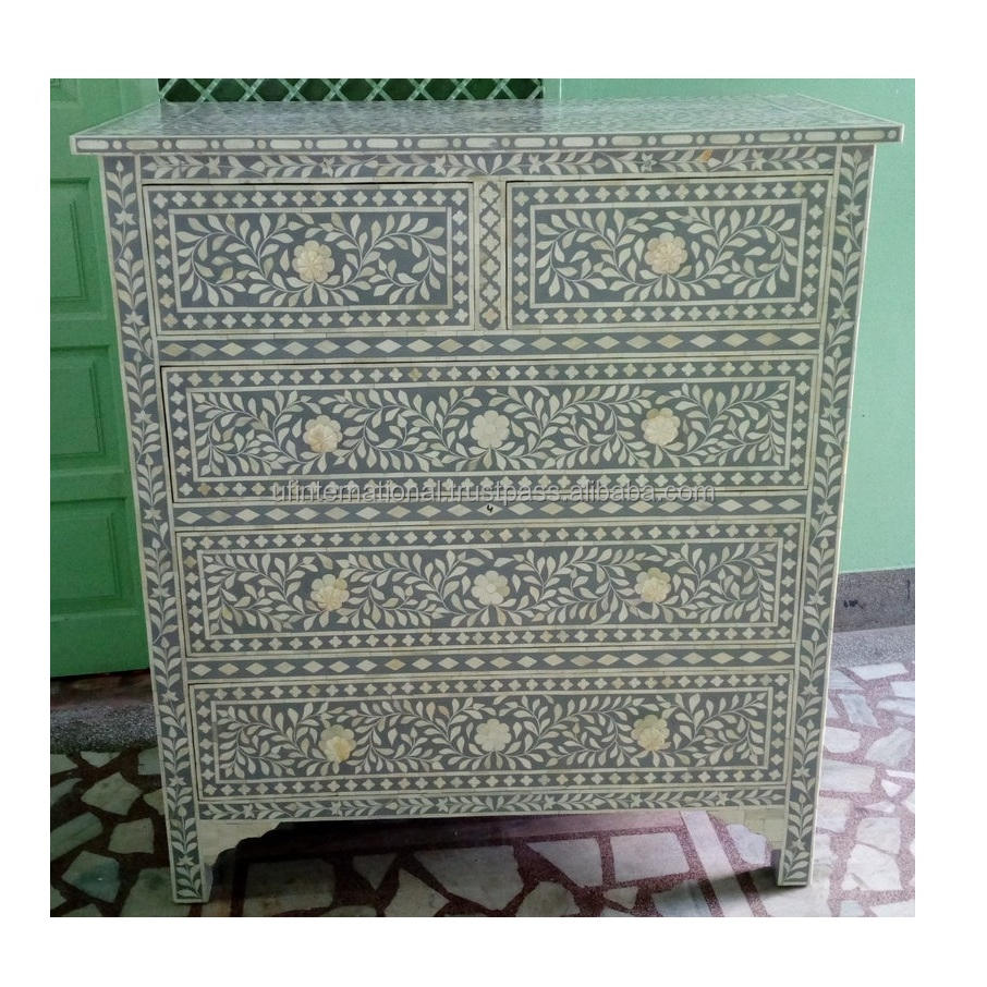 Table de chevet en tissu floral, incrustation d'os, tiroir de poitrine personnalisé de style indien, pour artisanat poli à la main