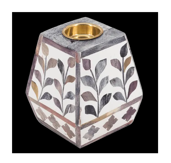 Porte-bougie en os incrusté, blanc et vert armée, motif feuille, forme hexagonale, pour bougies chauffe-plat et bougies classiques