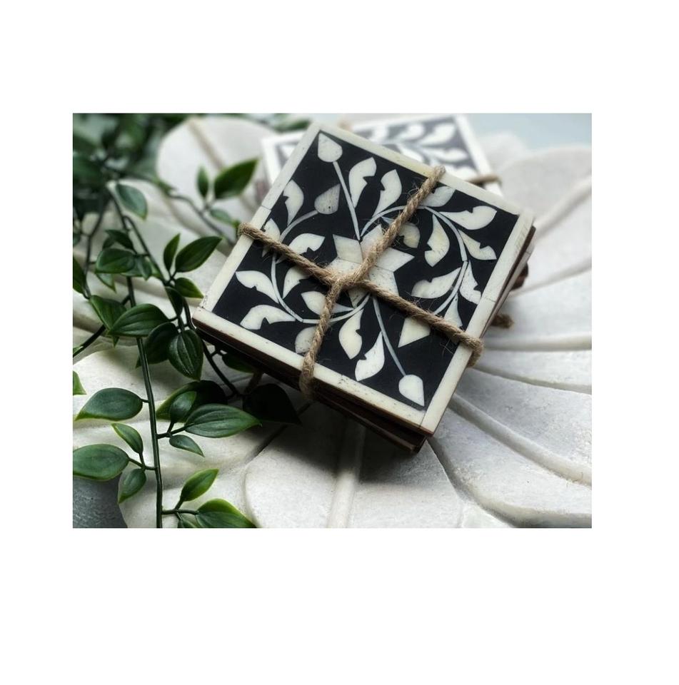 Dessous de verre en pierre incrusté d'os Quatre pièces de design de fleurs noires et blanches avec support Cuisine et vaisselle Articles décoratifs