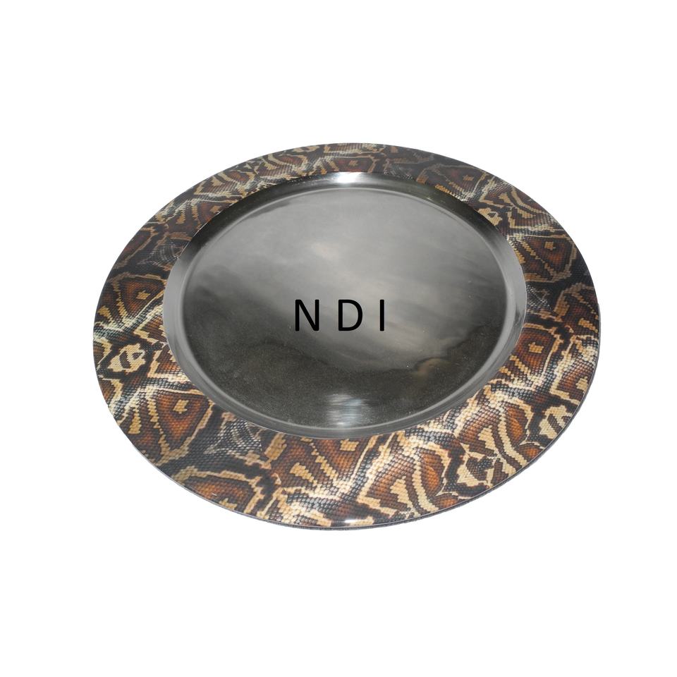 Bordure imprimée émail finition design fait à la main assiettes de chargeur arrondies vaisselle en acier inoxydable assiette de chargeur de service