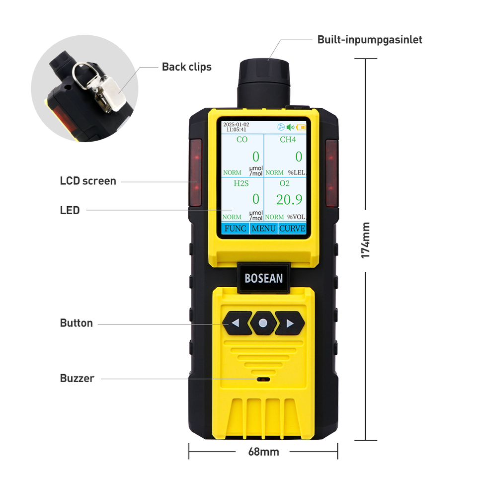 Dioxyde de carbone, Monoxyde de carbone, Gaz inflammable, Sulfure d'hydrogène, Oxygène, Gaz toxiqueGaz cible