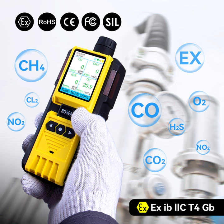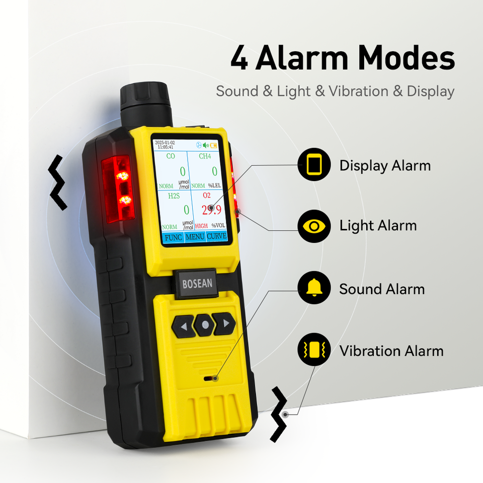 Dioxyde de carbone, Monoxyde de carbone, Gaz inflammable, Sulfure d'hydrogène, Oxygène, Gaz toxique
