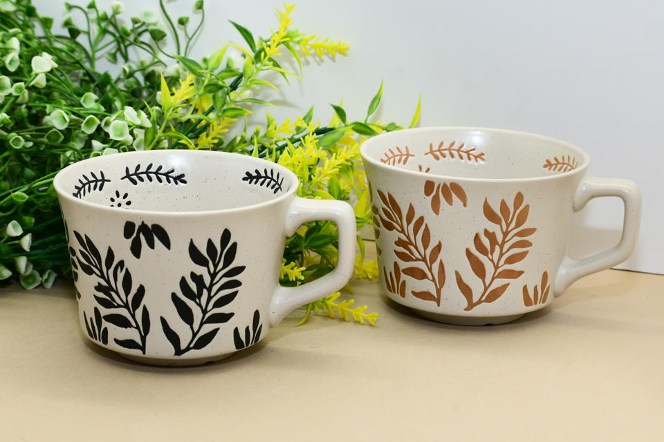 Tasse en céramique à motif de feuille botanique sérigraphiée, finition rustique mouchetée pour café, thé et cappuccino