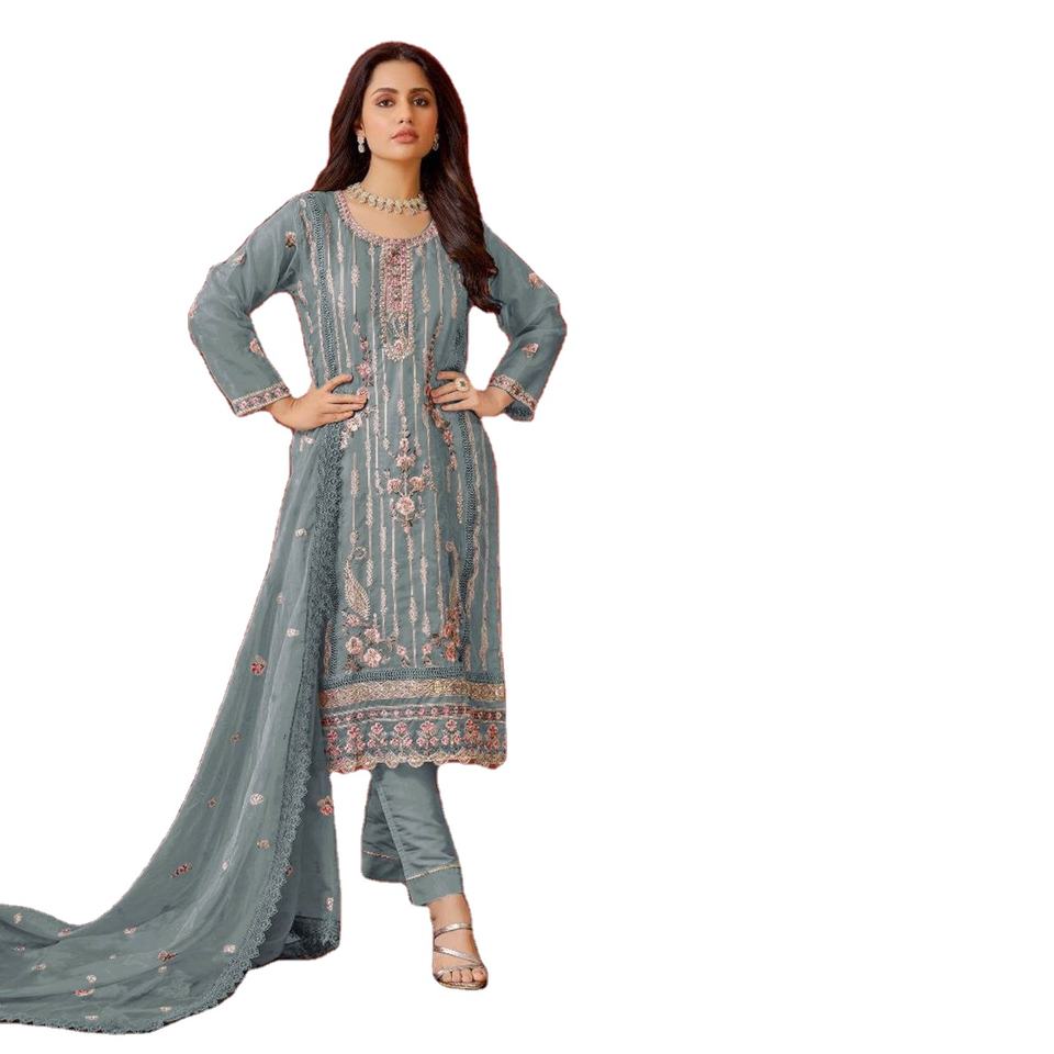 Les deux côtés broderie vrai miroir et pierre travail col rond 3/4 manches motif genou longueur Kurti & Pent avec Dupatta ensemble à la vente en gros