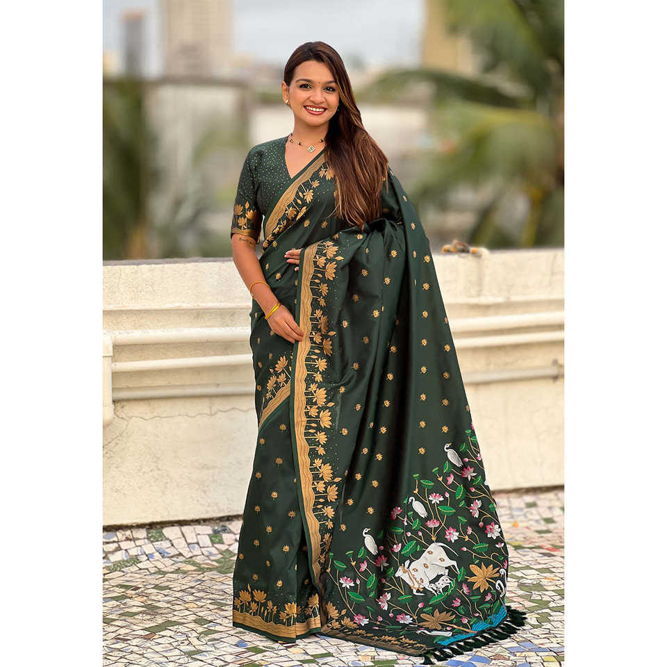 Bottle Green Zari Woven Pichwai Silk Saree Elegant Evening Dress