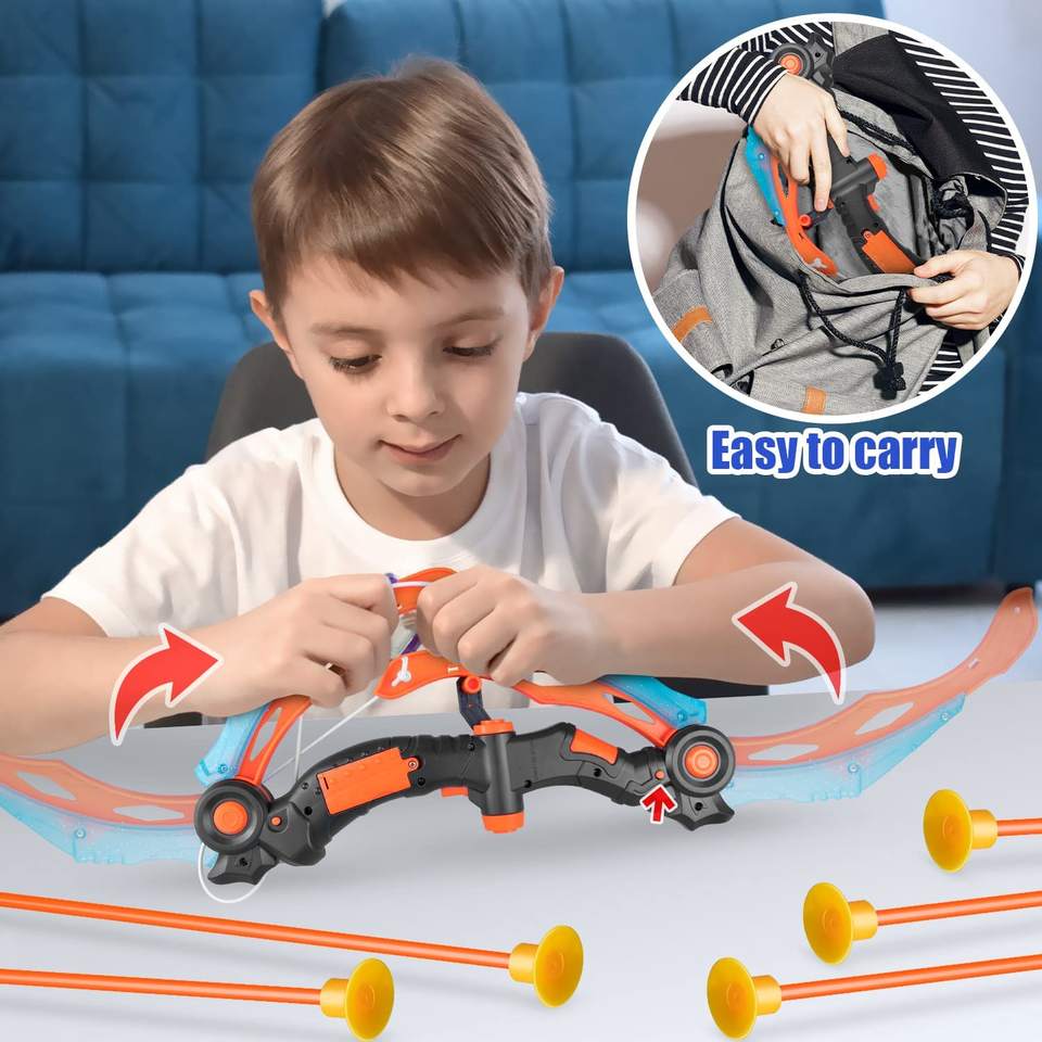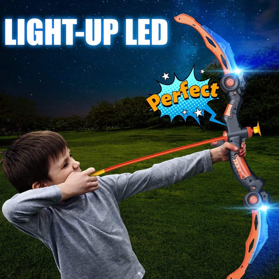 Arc et flèche pour enfants avec cible et carquois, jeu de tir à l'arc avec LED lumineuse et son, jouets d'intérieur et d'extérieur, 8 flèches à ventouse