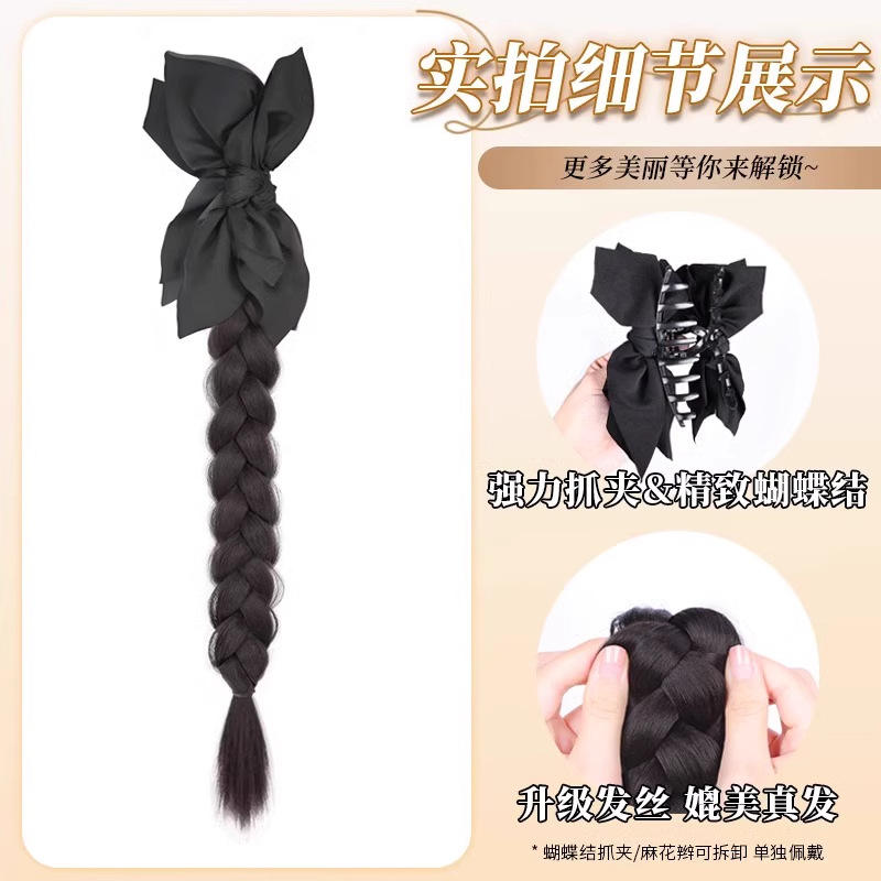 Queue de cheval tressée longue et réaliste, style coréen, avec pince papillon, pour femmes, en fibre haute température, tricotée à la main