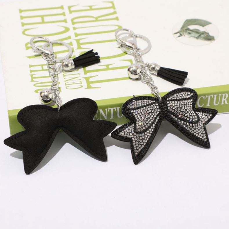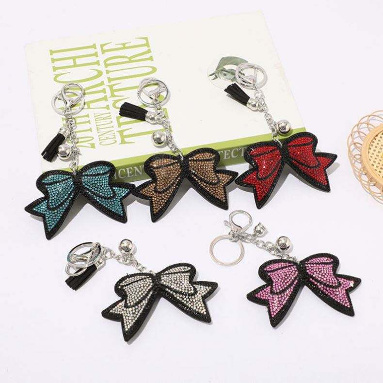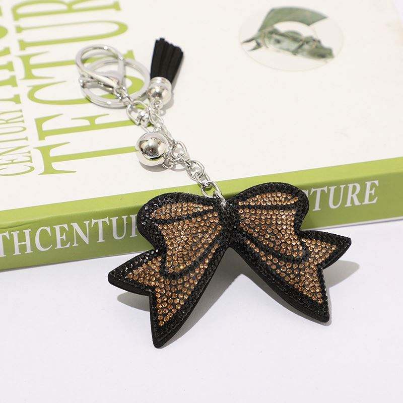 Porte-clés en cristal en forme de nœud papillon avec motif léopard, avec pompon et anneau en métal, prix de gros, accessoires pour clés