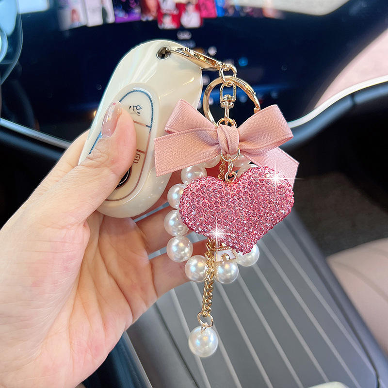 Porte-clés Pendentif Cœur Nœud Papillon Perle Diamant Pêche, Porte-clés de Voiture en Alliage Strass avec Chaîne de Perles pour Sac à Main