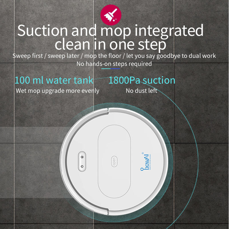 Aspirateur robot BowAi OB11, 0,6-1L, alimenté par batterie, recharge automatique, navigation par gyroscope, 150 m² et plus