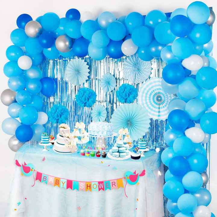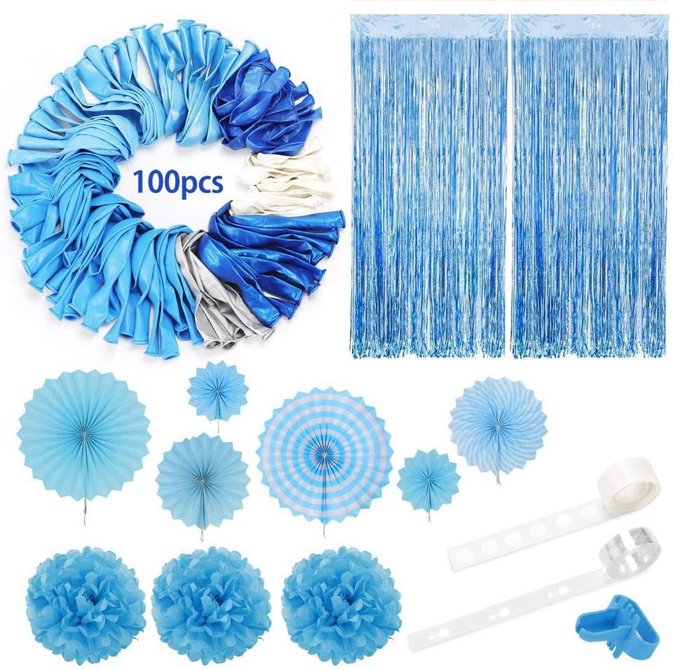 Décorations d'anniversaire pour garçon, éventail en papier bleu, fleur, ballon en latex, chaîne, guirlande en arc, décoration de fête