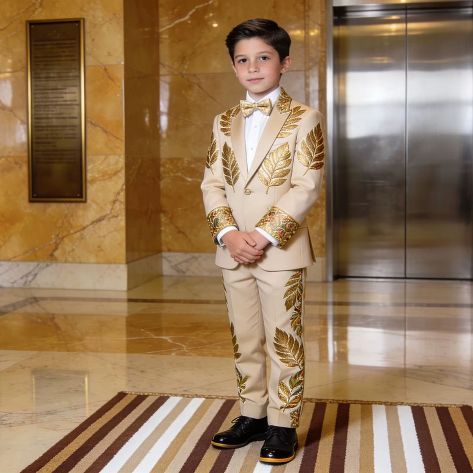 Ensemble de costume brodé crème pour garçons avec motif feuille dorée – Smoking formel pour mariage et fête pour enfants