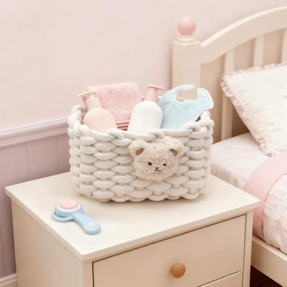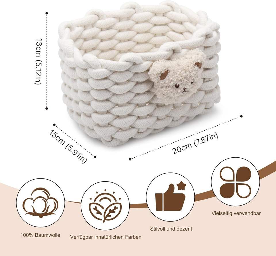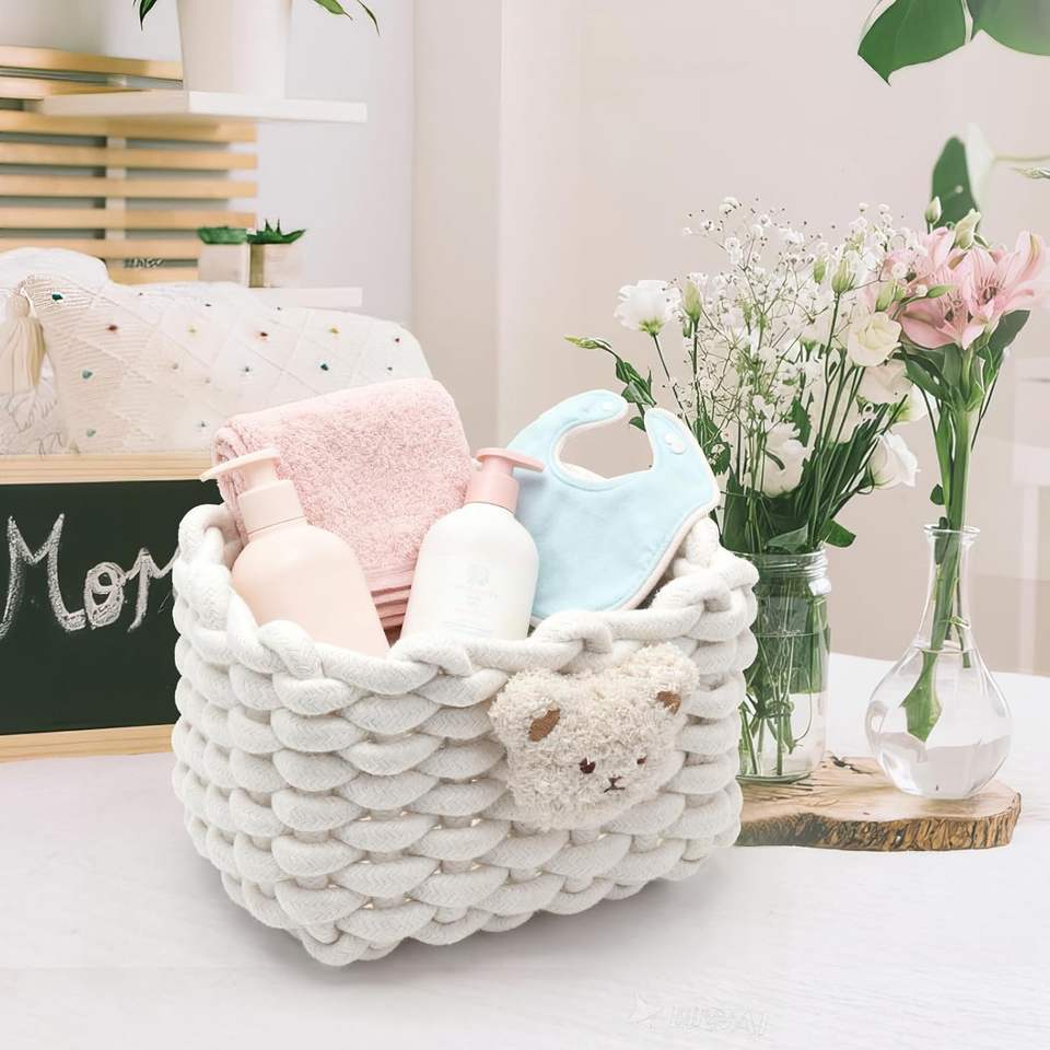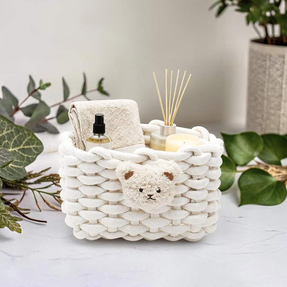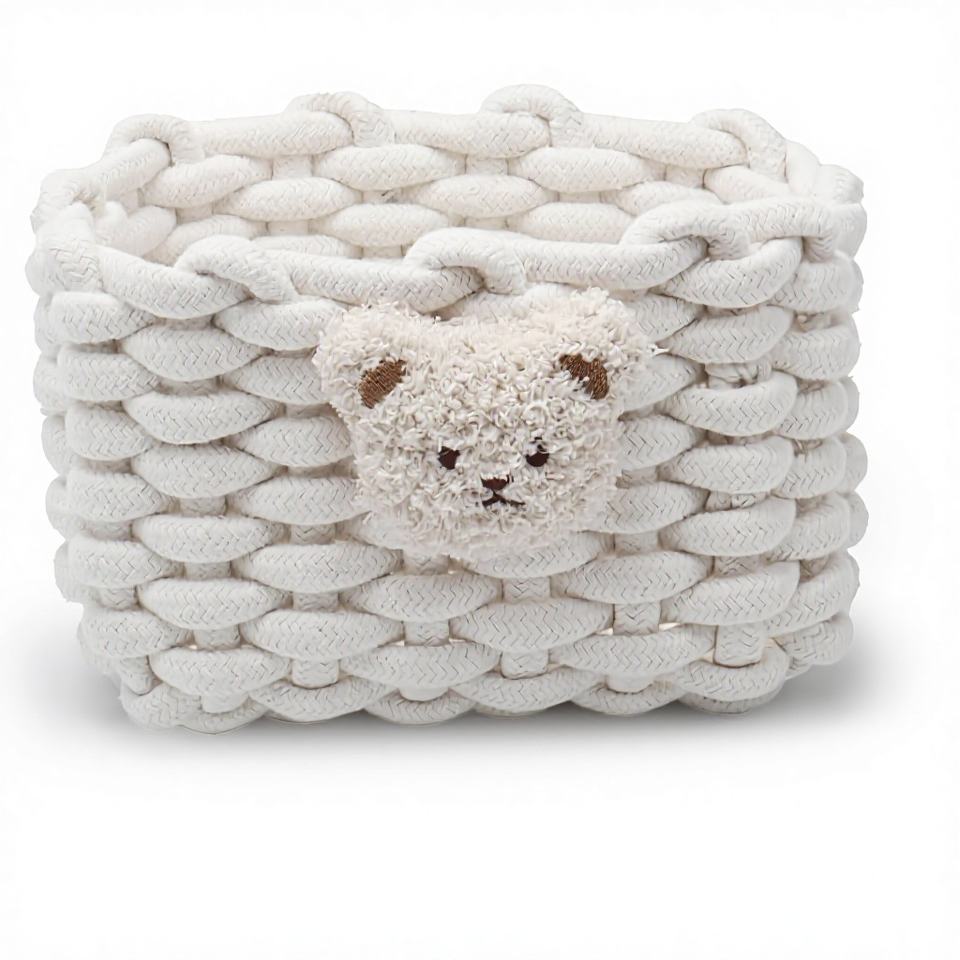 Panier de rangement rectangulaire en coton tressé à motif ours, écologique, blanc, pour salle de bain, bureau, coiffeuse, armoires