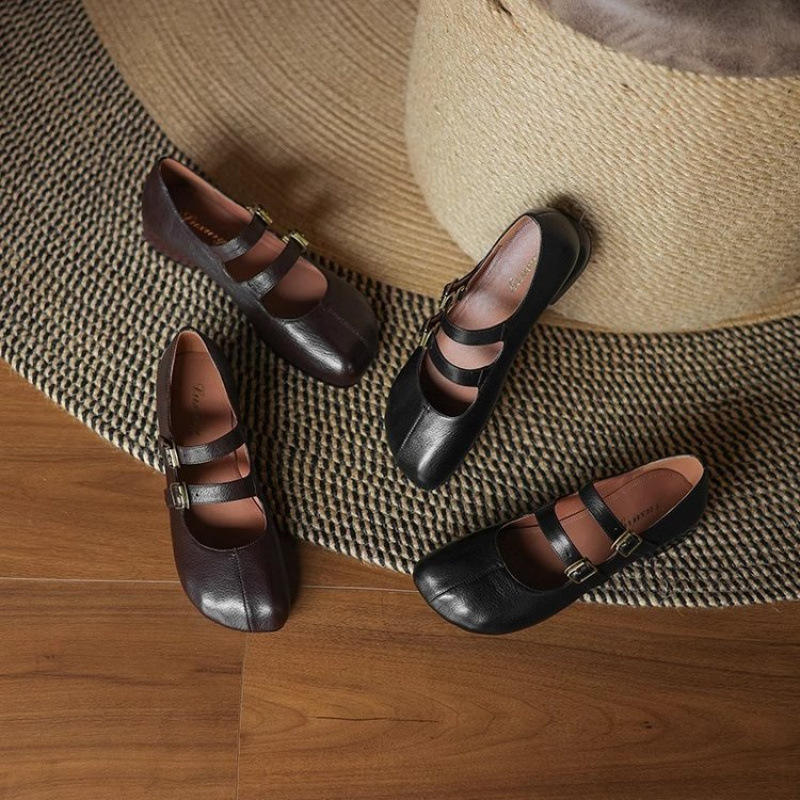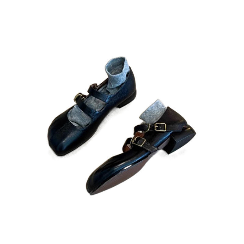 Brand 2025 Spring New Ballet Shoes for Women Double Strap Low Heel Soft Leather Mary Jane 3cm Thick French Heel Insole PU