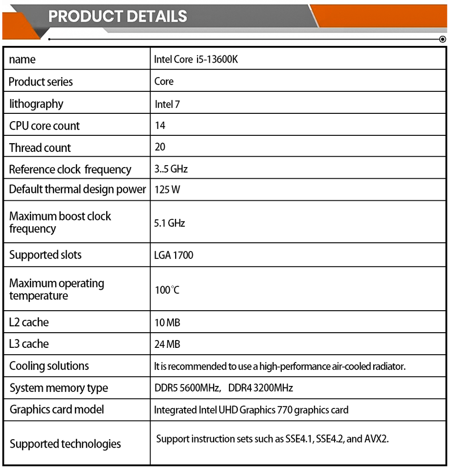 Nouveau processeur de bureau Core I5-13600K 14 cœurs (6 cœurs P + 8 cœurs E) Cache 24M, jusqu'à 5.1 GHz