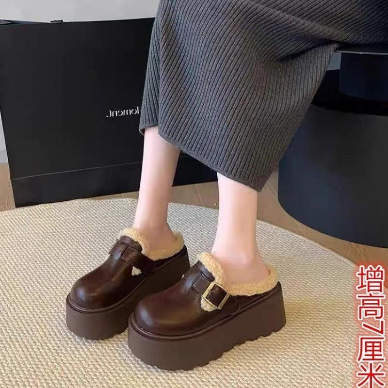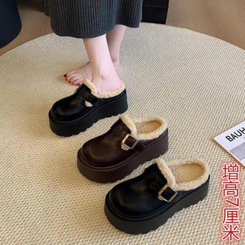 Brand Platform Thick-Soled Women's Birkenstocks 2024 Winter Half-Slippers Velvet Closed-Toe Leather Fur Fashion Fur for Slippers