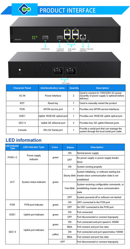 Tout nouveau Mini 1Port GPON AC OLT QT7001 C ++++ SFP Port PON unique 1G 10G OLT 1/2/4/8/16 Ports terminal de réseau à fibre optique