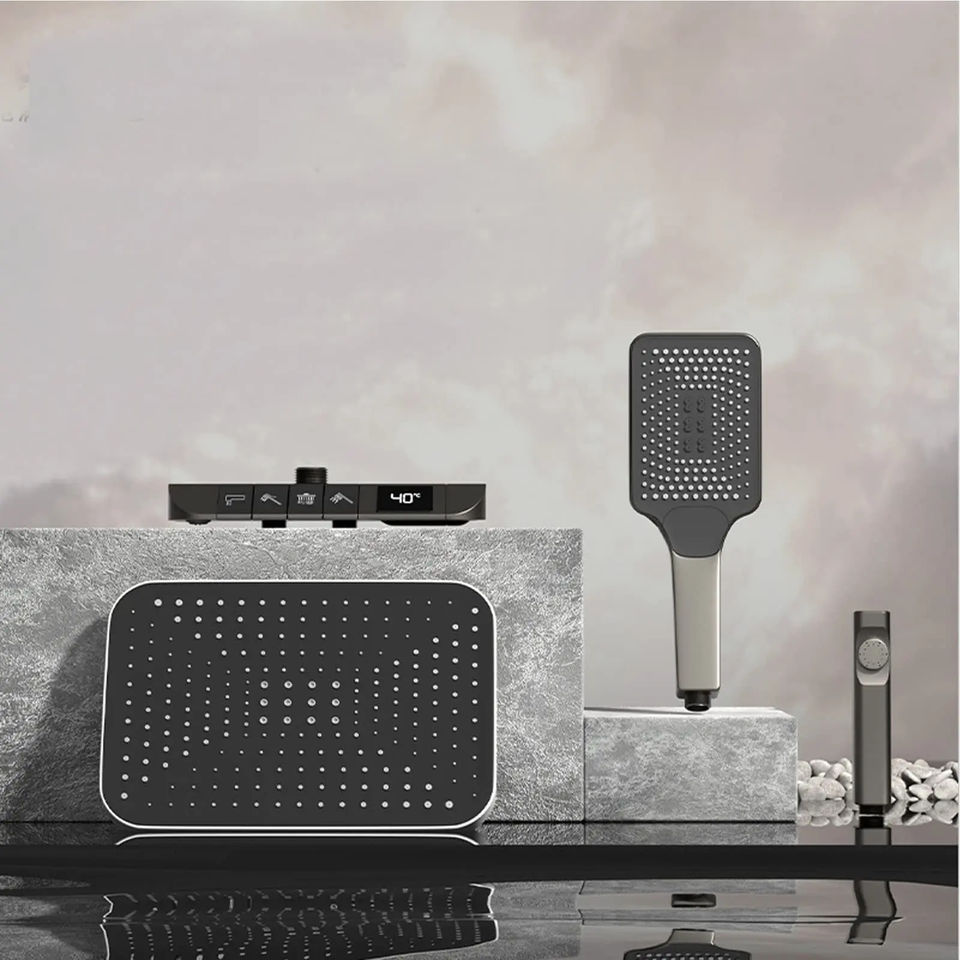 Ensemble de douche de salle de bain en laiton avec affichage numérique LED Robinet mitigeur à 4 touches de piano Motif de pulvérisation de pluie Crée une atmosphère dans la salle de bain