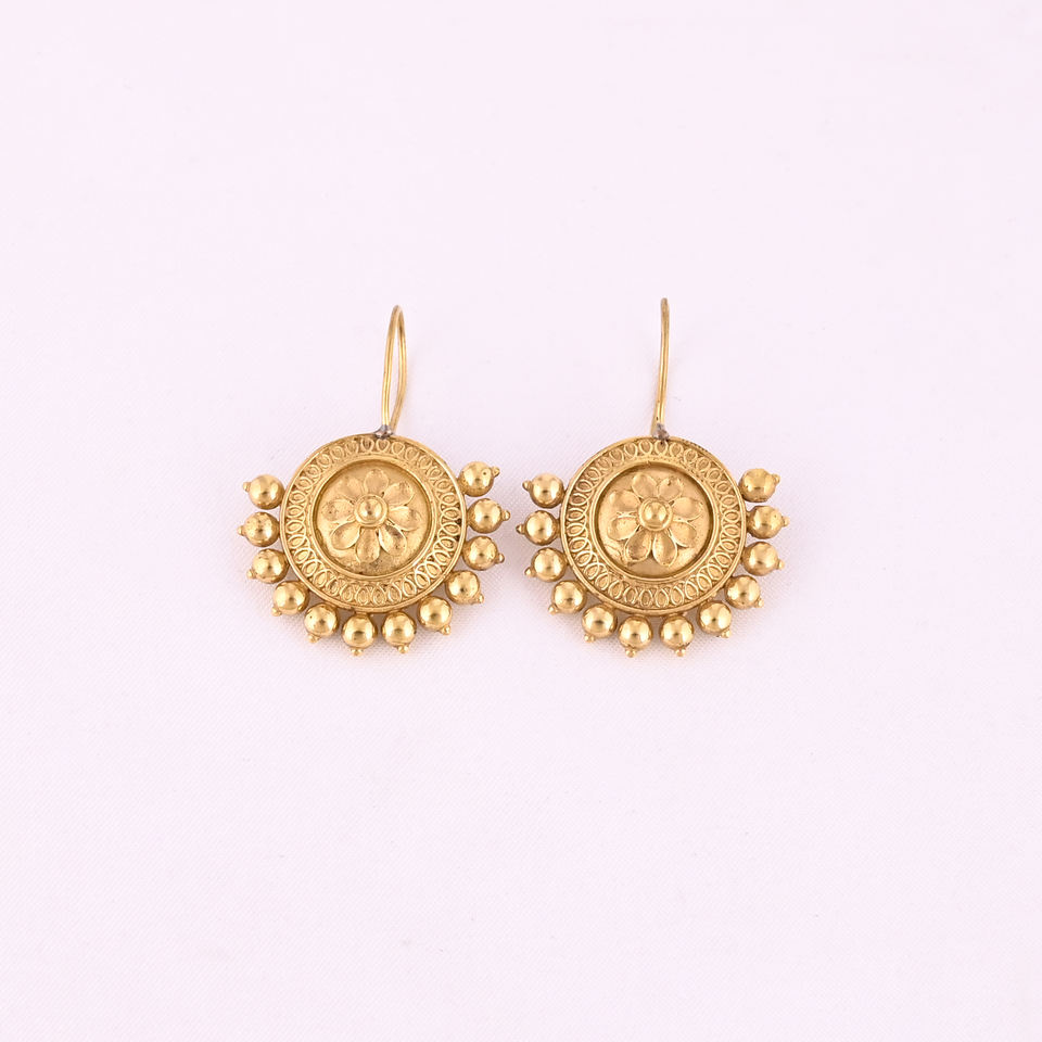 name or words:Gold Plated Circular Jhumkas With Floral Motiff