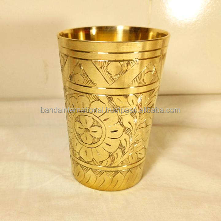 Verre à eau en laiton avec conception de gravure Verre à boire en métal avec finition antique en laiton polonais