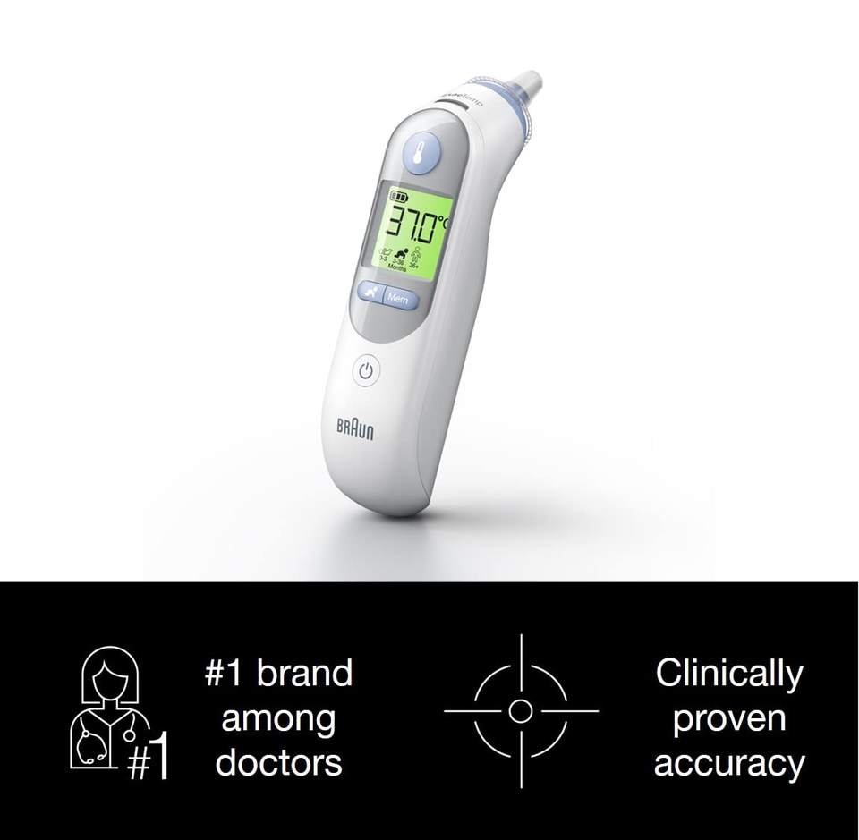 Thermomètre auriculaire Braun Thermo Scan 7, édition noire (Précision de l'âge, Silencieux, Affichage de la température par code couleur, Fièvre, Hygiénique)