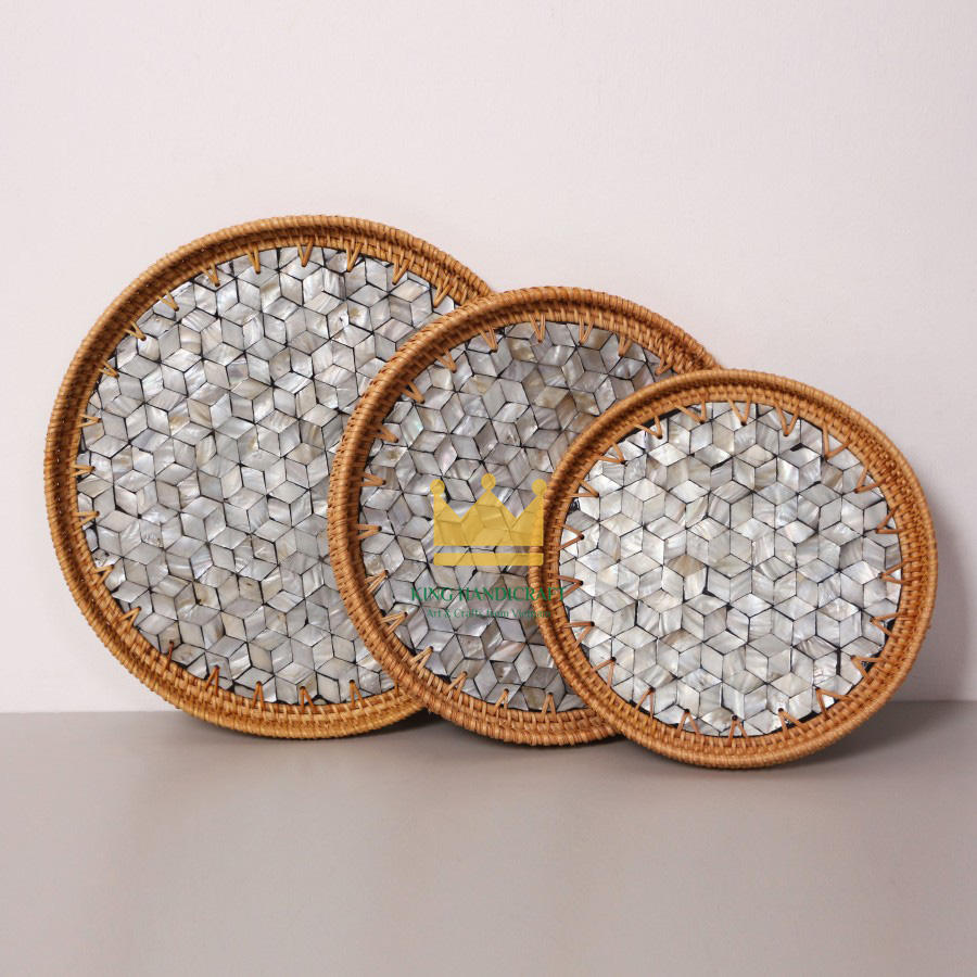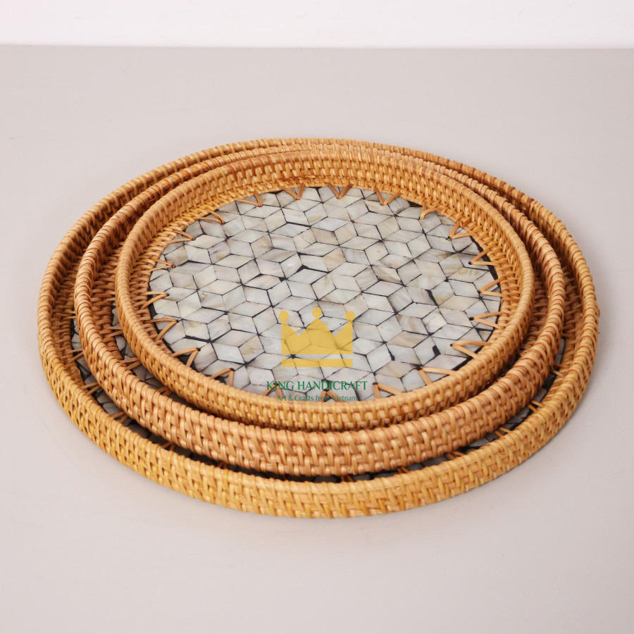 Pain Fruits Alimentaire Café Petit Déjeuner Stockage Affichage Rond Rotin Tissé Plateau de Service avec Nacre Incrustation Prix Pas Cher