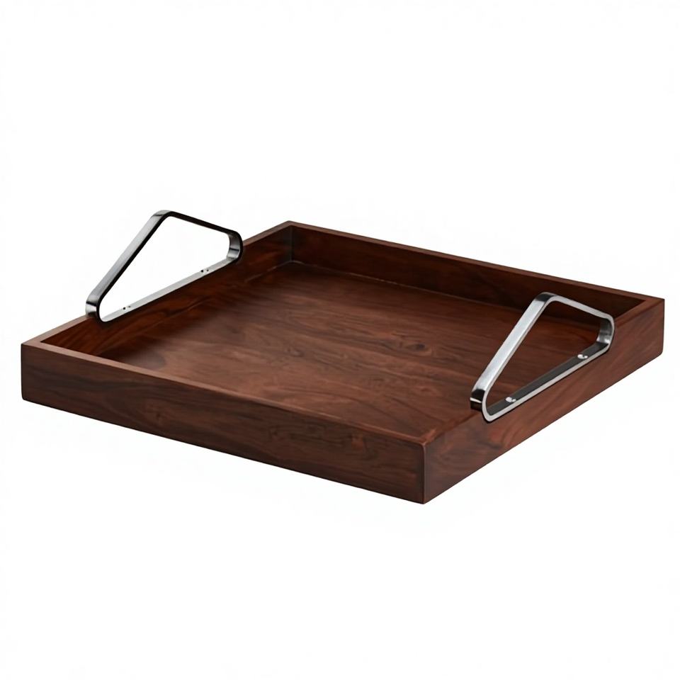 Plateau de service pour petit-déjeuner avec poignées métalliques, plateau en bois poli personnalisé OEM/ODM, plateau de table décoratif de qualité supérieure pour la maison