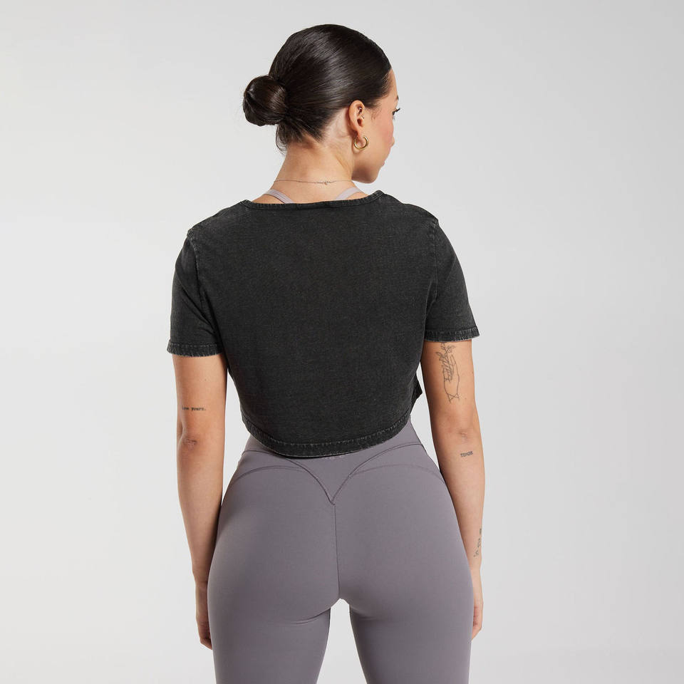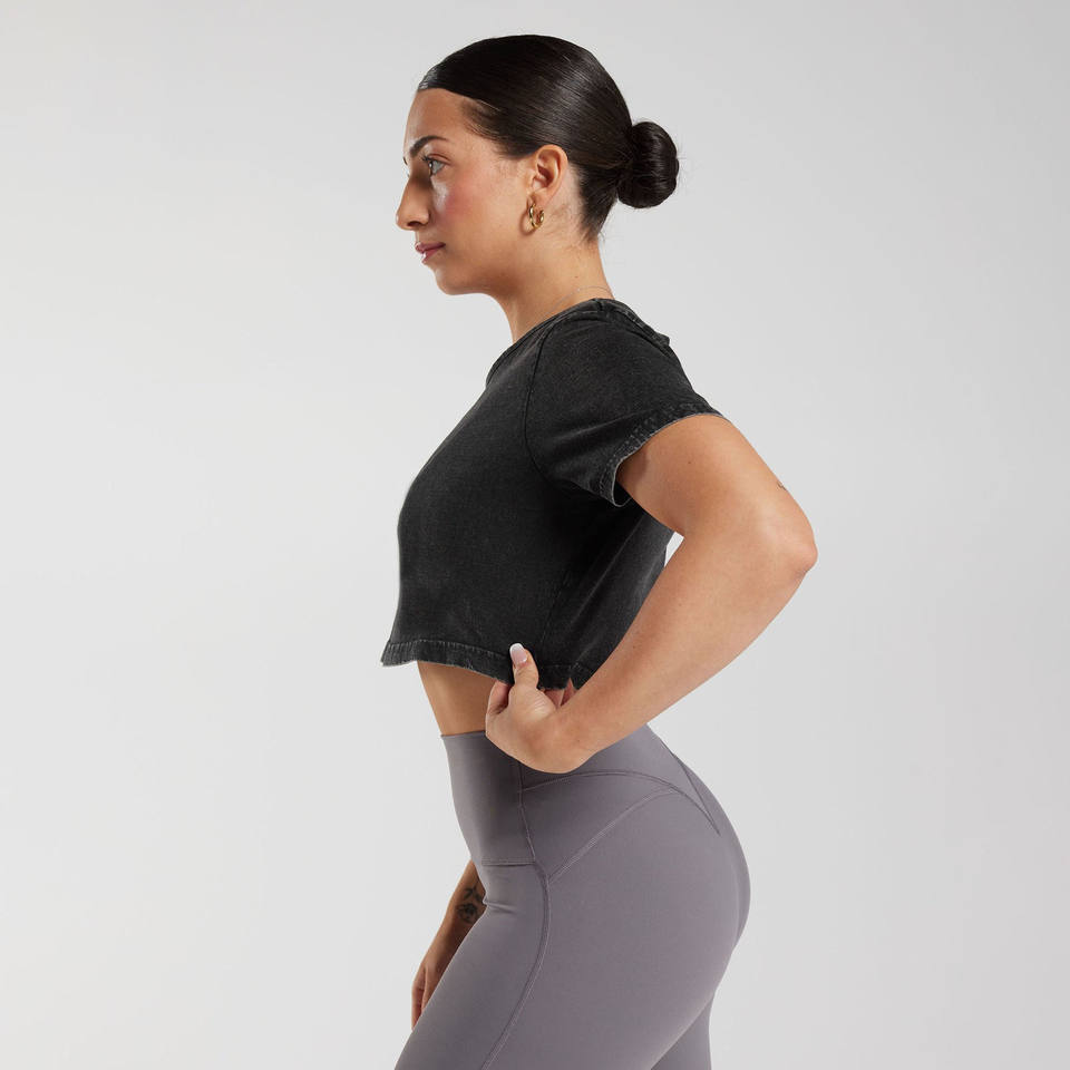 T-shirt court respirant personnalisé pour femme, délavé à l'acide, style vintage, col rond, manches courtes, avec appliqué décoratif personnalisé en GSM