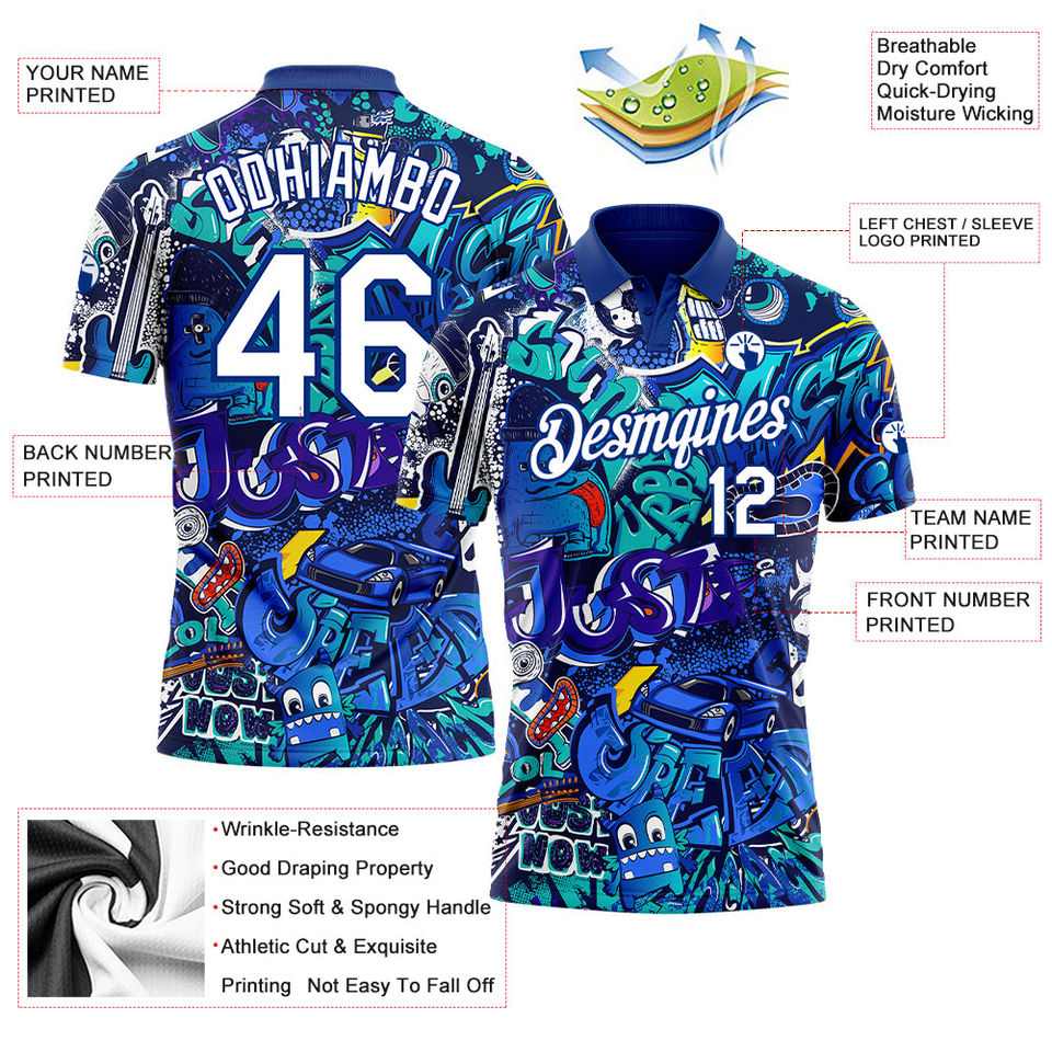 Col chemise en tissu polaire respirant à séchage rapide, imprimé graffiti personnalisé, blanc royal 3D, idéal pour le golf et les activités de plein air