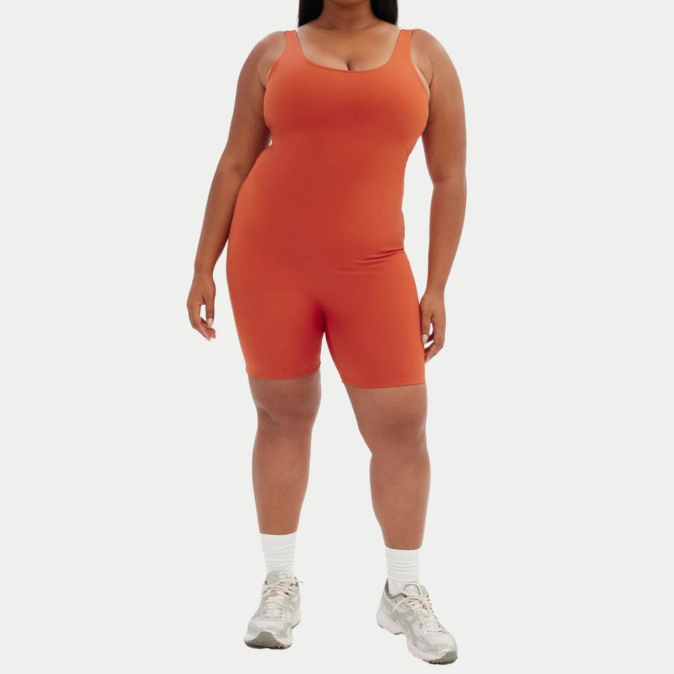 Women's Casual One Piece Workout Romper Solid Pattern Breathable Deep Back Yoga Jumpsuit Shorts Built-in Bra Tummy Control