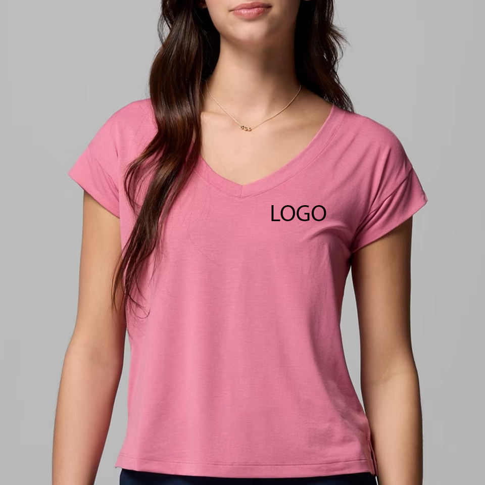 T-shirt décontracté pour femme en polyester respirant et doux avec logo personnalisé, col en V, toucher doux, haut léger pour femme