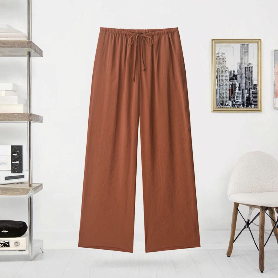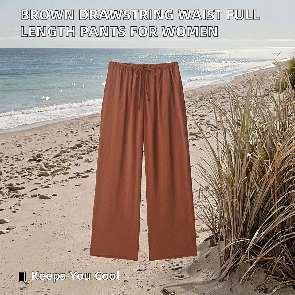 Pantalon long décontracté en tissu tissé à taille mi-haute avec cordon de serrage, respirant, pour l'été, couleur marron, pour femmes, OEM