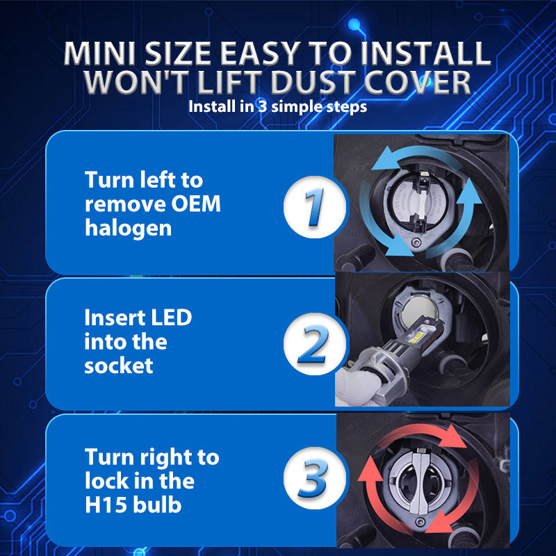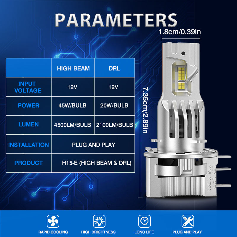 Brieyes Nouveau Design Haute Puissance H15 LED Taille Halogène 1:1 45W 9000LM Feux de Jour 20W 6000K DRL Sans Fil