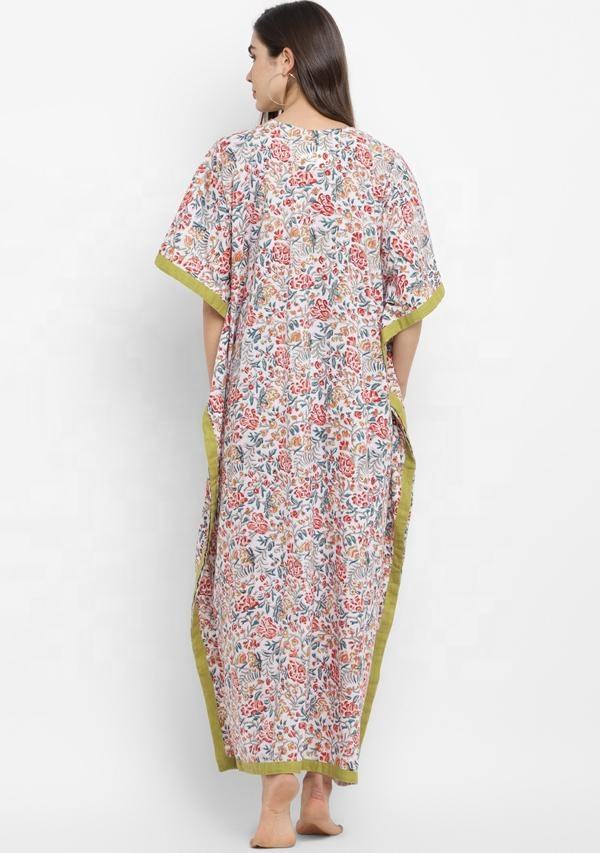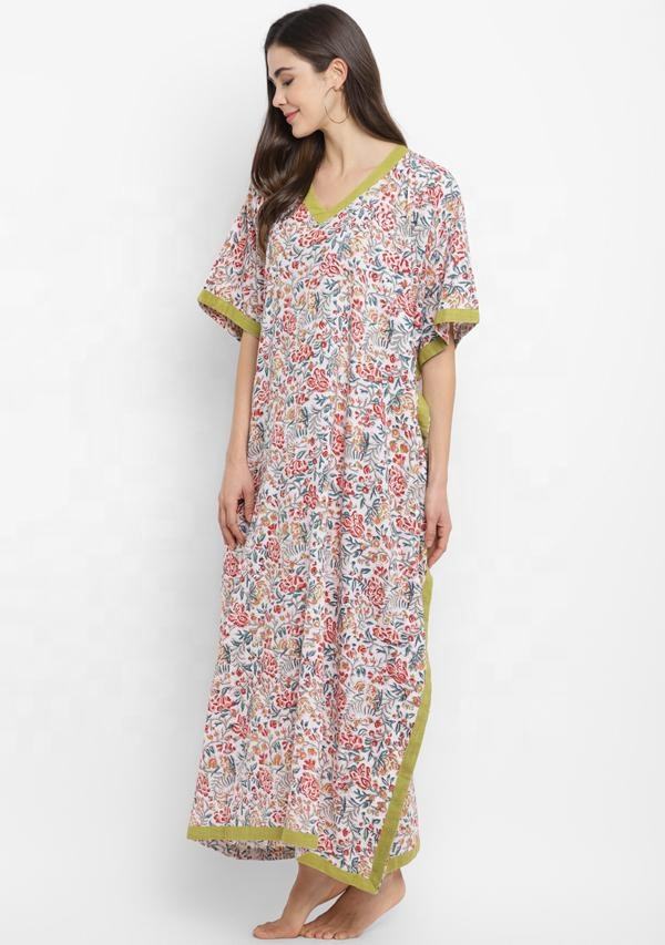 Cozy Comfortable 100% Natural Cotton Kaftan Handicraft Floral Printed V-Neck Brightly Colored Indian Floor-Length Washable