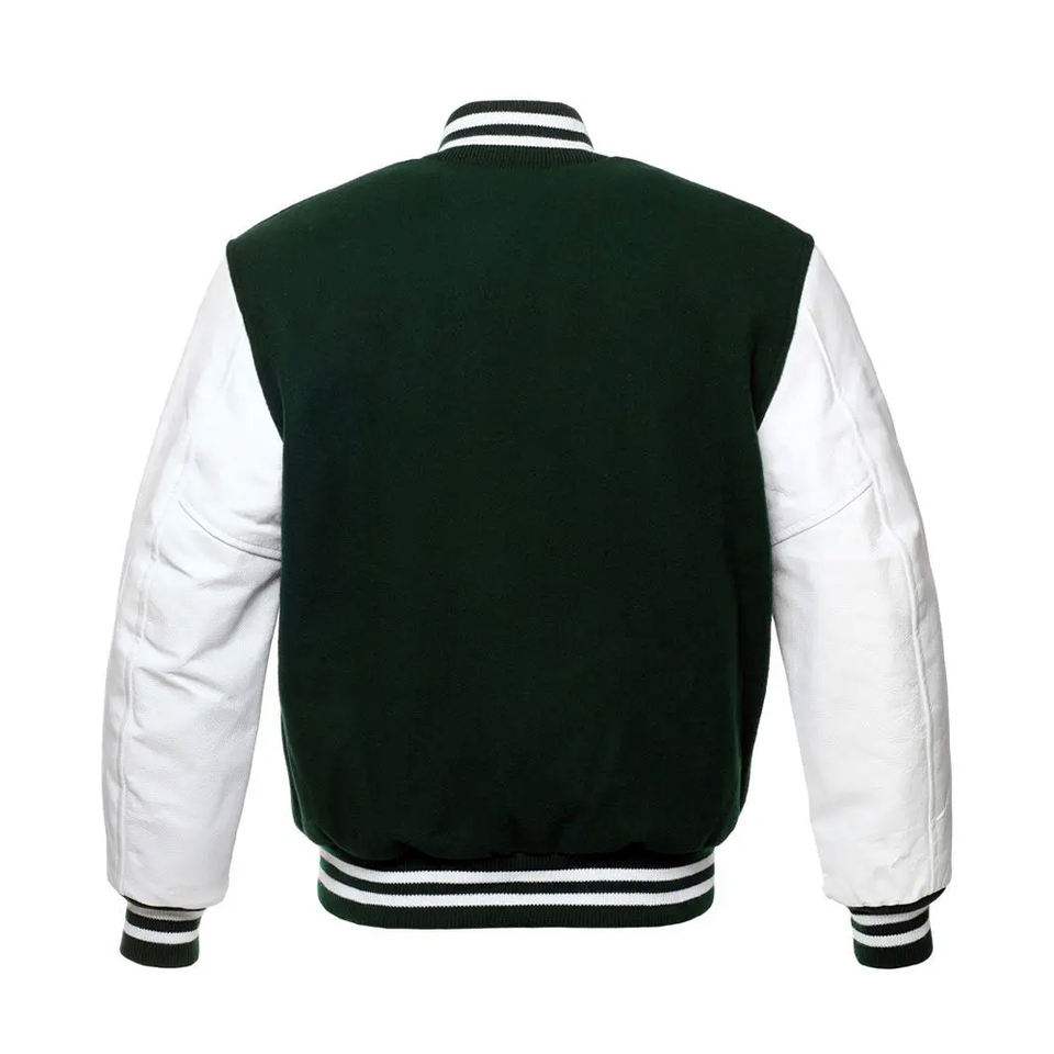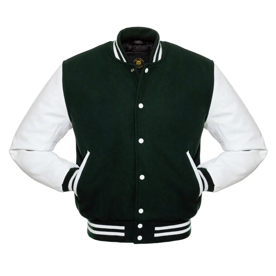 Veste bomber varsity à manches blanches brillantes, veste letterman avec manches en cuir, veste varsity en cuir letterman