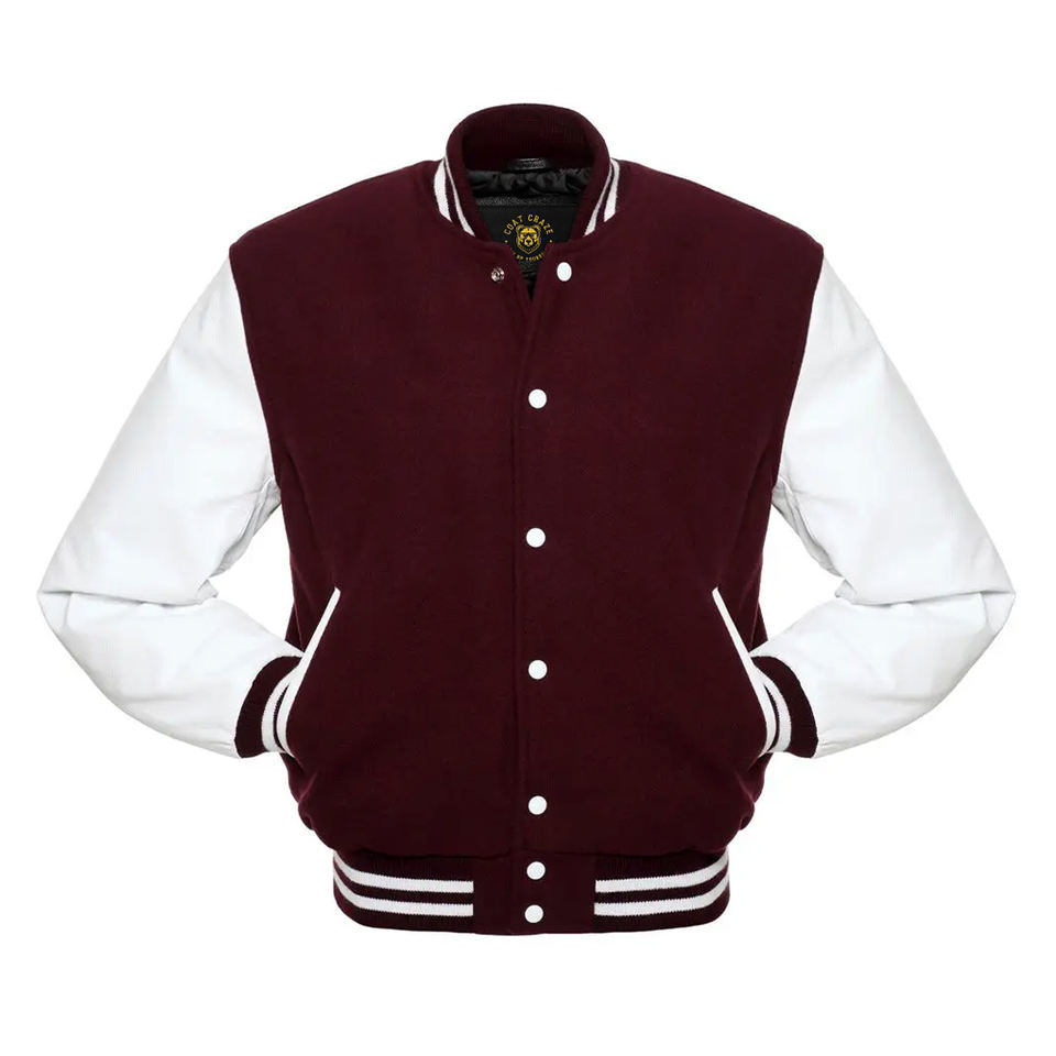 BrightWhite Maroon Body Stand Collar Varsity Jacket with Front Logo Custom Leather Sleeves for Men