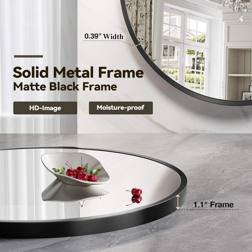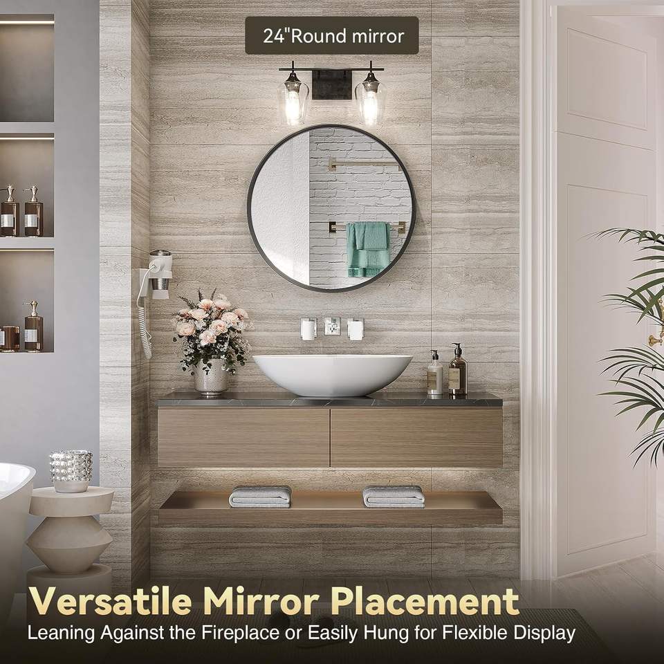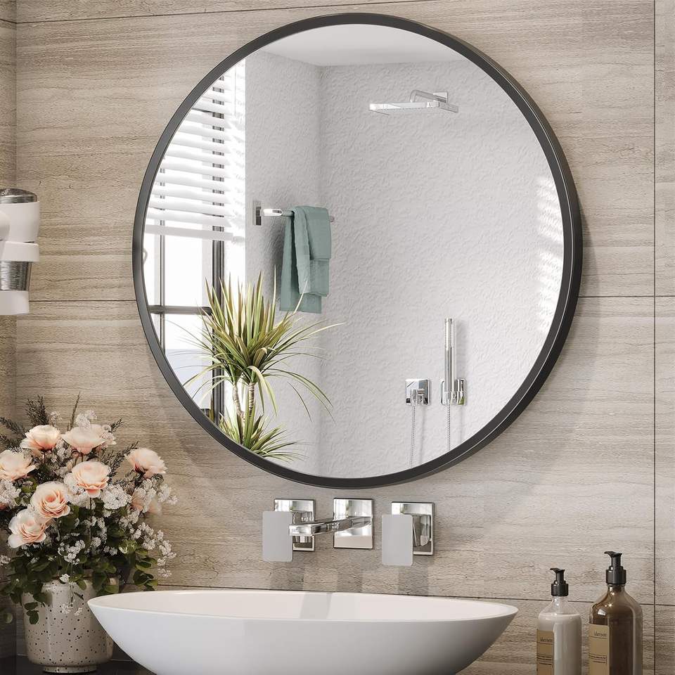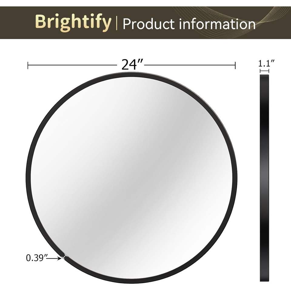 Miroir rond noir Brightify de 24 pouces, miroir de salle de bain contemporain à fixation murale, cadre en verre