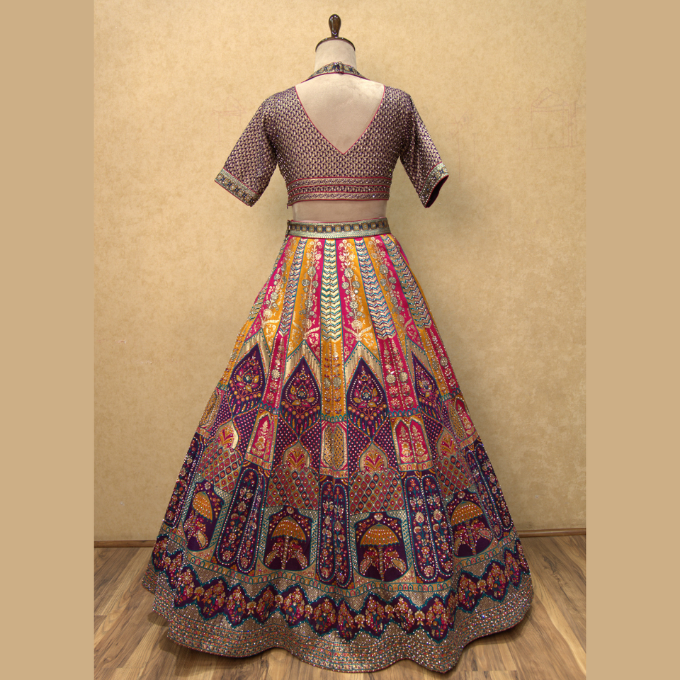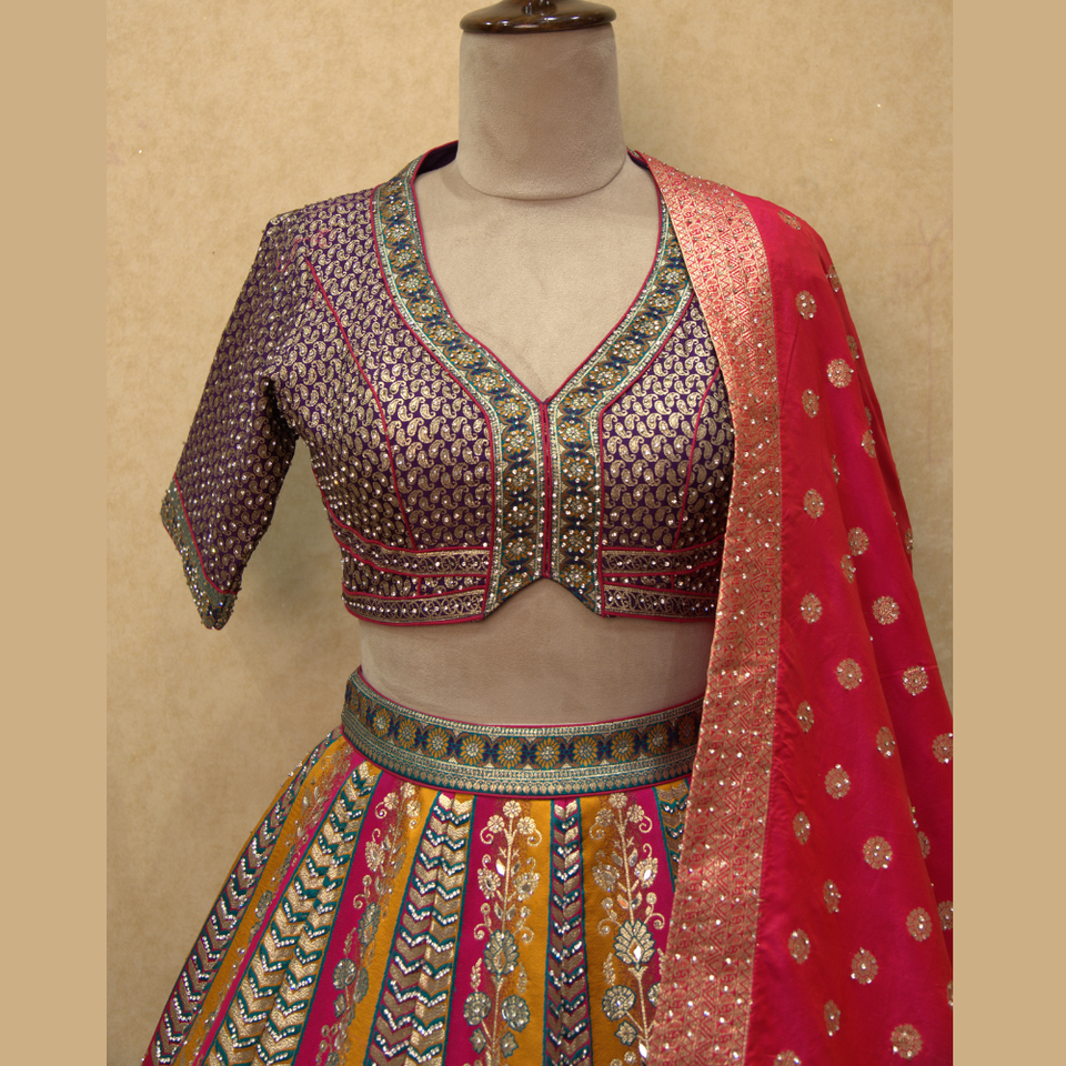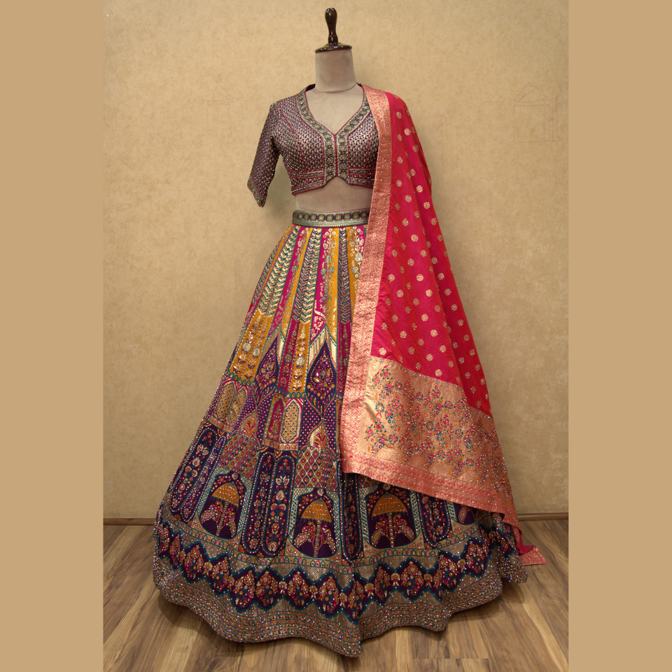 Brocart de soie Vibrant multi couleur Lehenga avec un travail manuel exquis en diamant et un tissage Zari disponible en vrac pour l'Inde