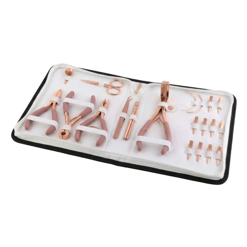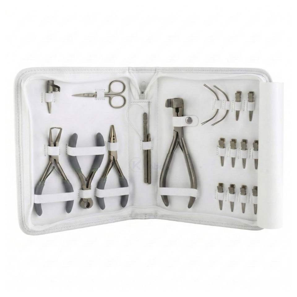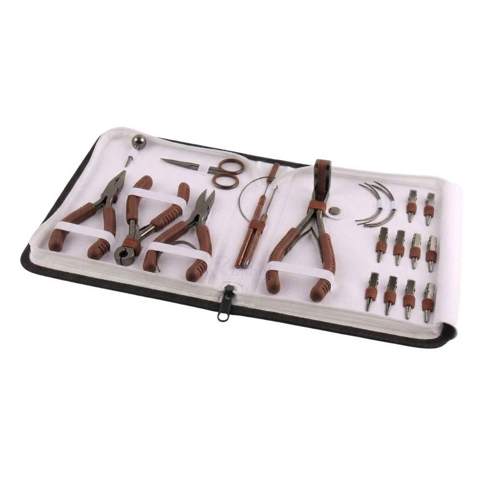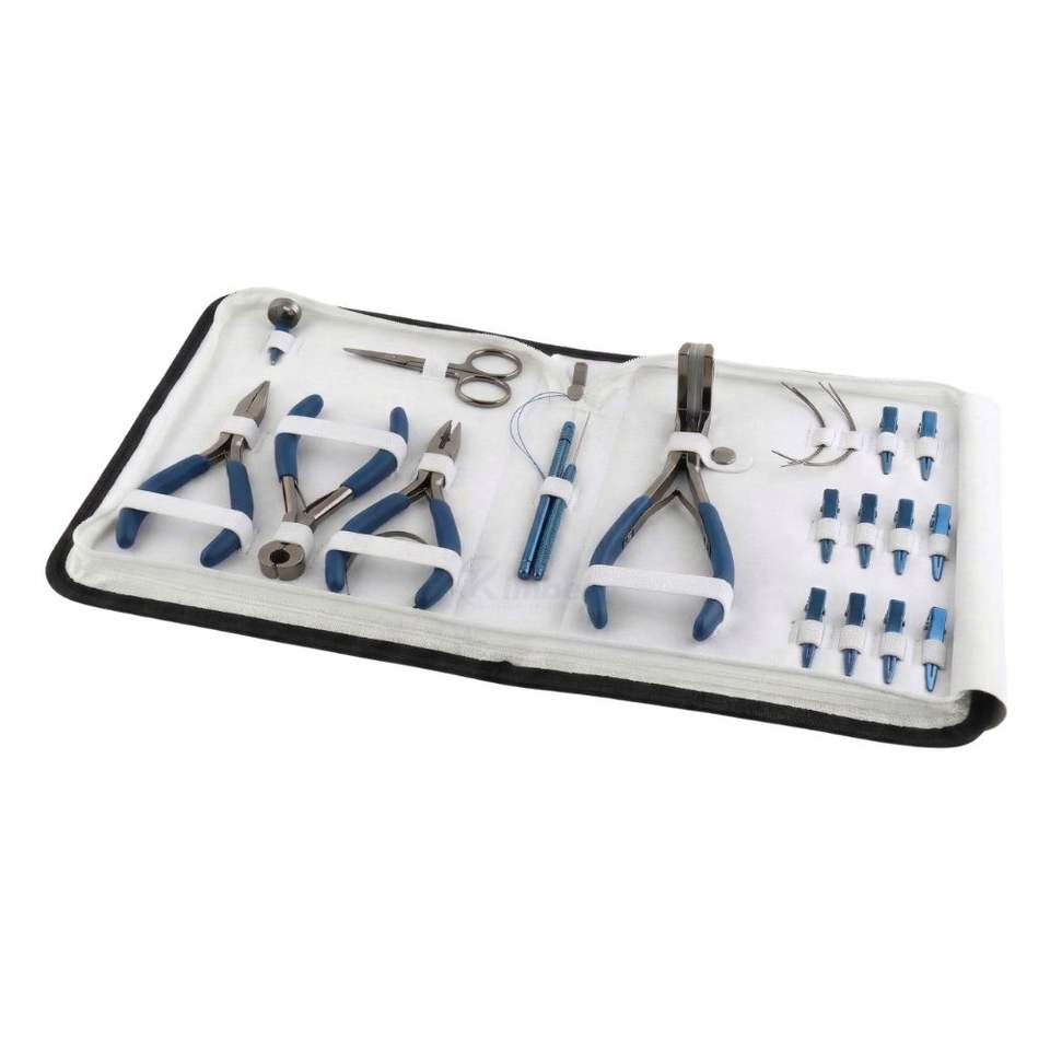 Le kit comprend:Pinces, ciseaux, aiguille à tirer, enfile-boucle, clips