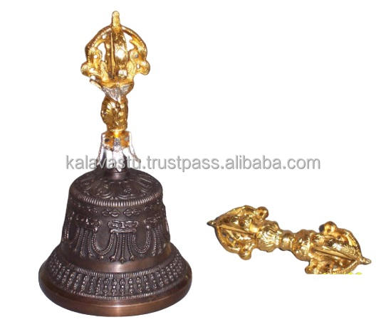 Mélangeur en métal en bronze sept cloche tibétaine avec support design en finition dorée antique article religieux